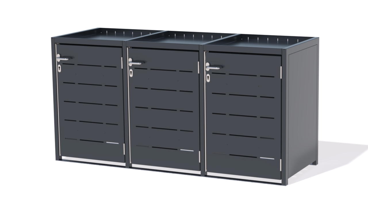 Die robusten Mülltonnenboxen aus feuerverzinktem, pulverbeschichtetem Stahl sind abschließbar, wetterfest und haben eine Türverkleidung mit der Lamellenoptik. DIN EN 1090-zertifiziert, ideal für private oder gewerbliche Außenflächen, gefertigt in Deutschland.