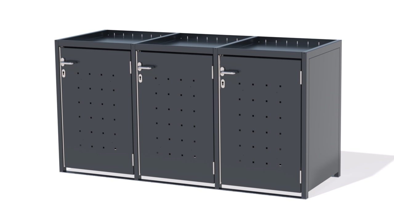 Die robusten Mülltonnenboxen aus feuerverzinktem, pulverbeschichtetem Stahl sind abschließbar, wetterfest und haben eine Türverkleidung mit der Quadratlochung. DIN EN 1090-zertifiziert, ideal für private oder gewerbliche Außenflächen, gefertigt in Deutschland.