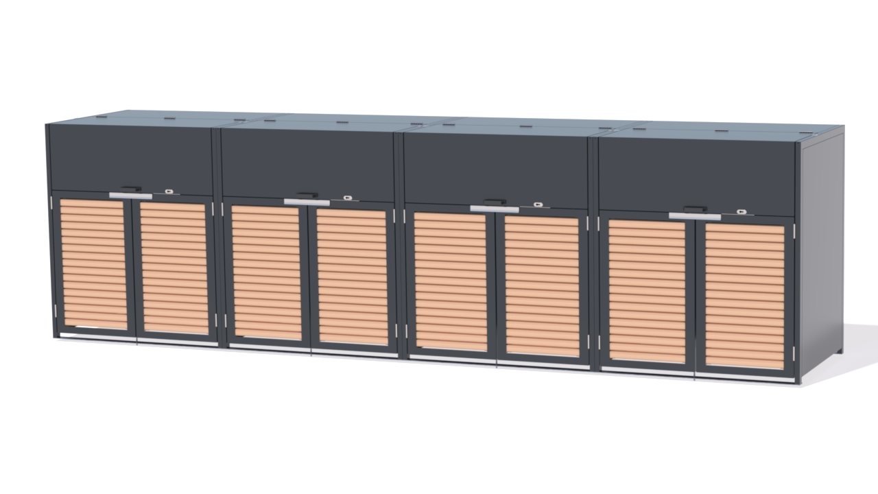 Unsere 4er Müllcontainerbox Original vereint zeitlos elegantes Design mit bester deutscher Fertigungsqualität, individuell gestaltbar, sicher verschließbar und nach DIN EN 1090 zertifiziert für maximale Langlebigkeit und Stil in jeder Umgebung.
