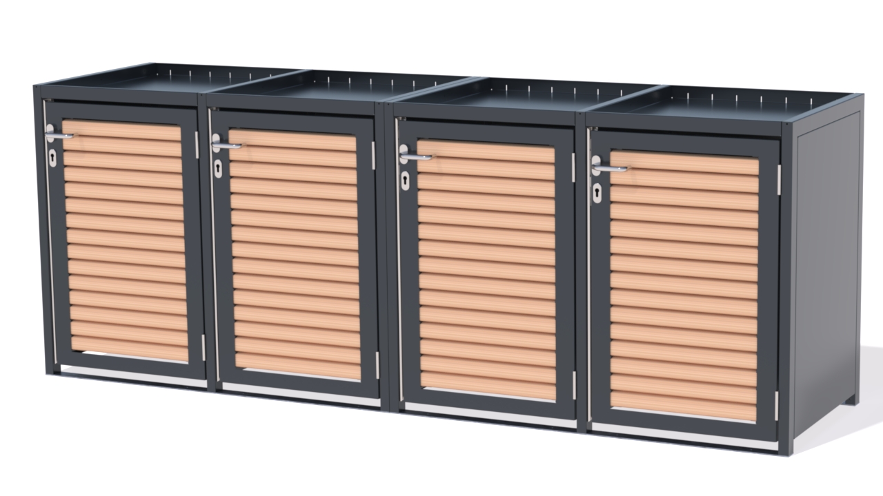 Die robusten Mülltonnenboxen aus feuerverzinktem, pulverbeschichtetem Stahl sind abschließbar, wetterfest und haben eine Türverkleidung mit der Holzlattung waagerecht. DIN EN 1090-zertifiziert, ideal für private oder gewerbliche Außenflächen, gefertigt in Deutschland.