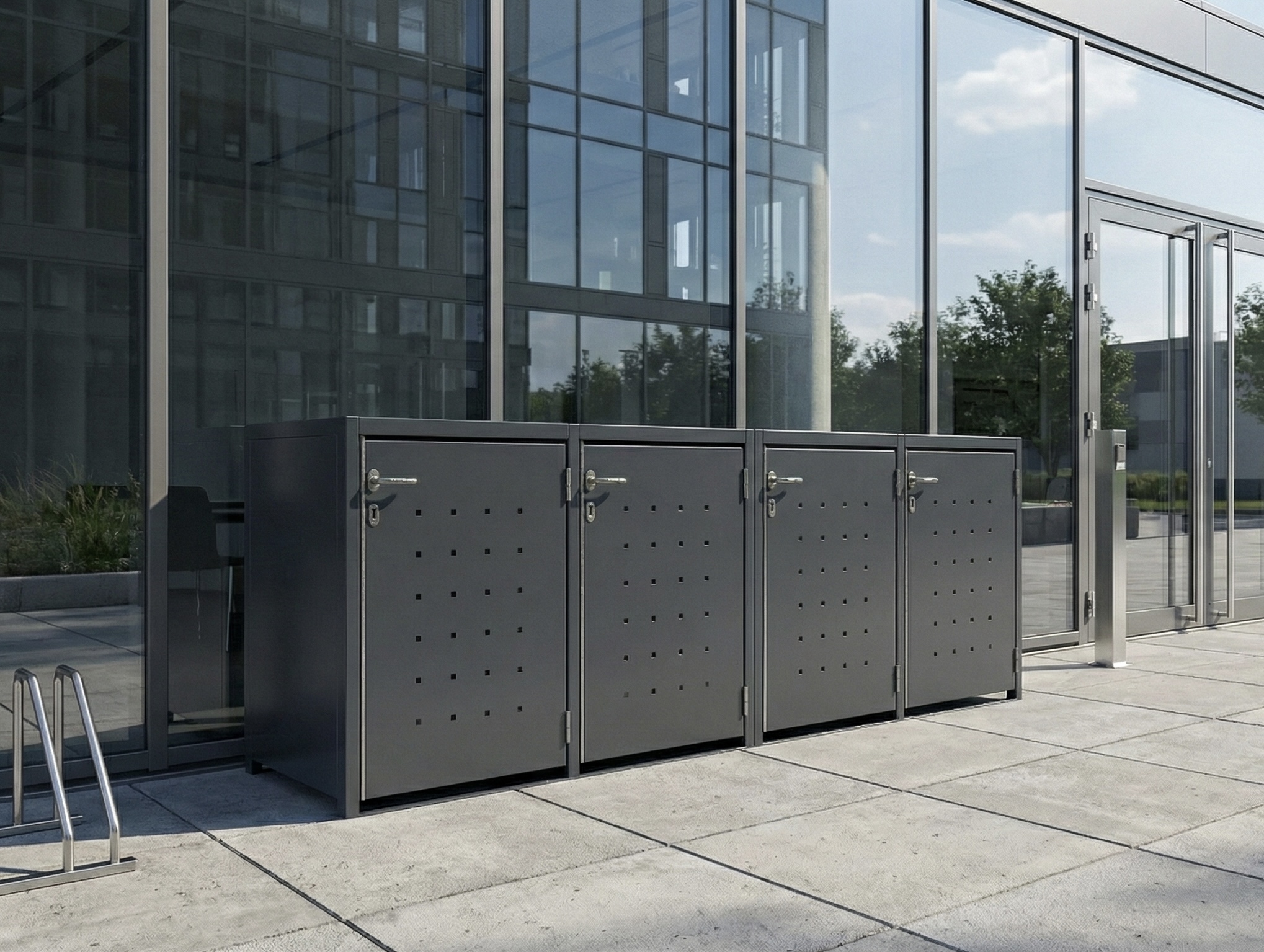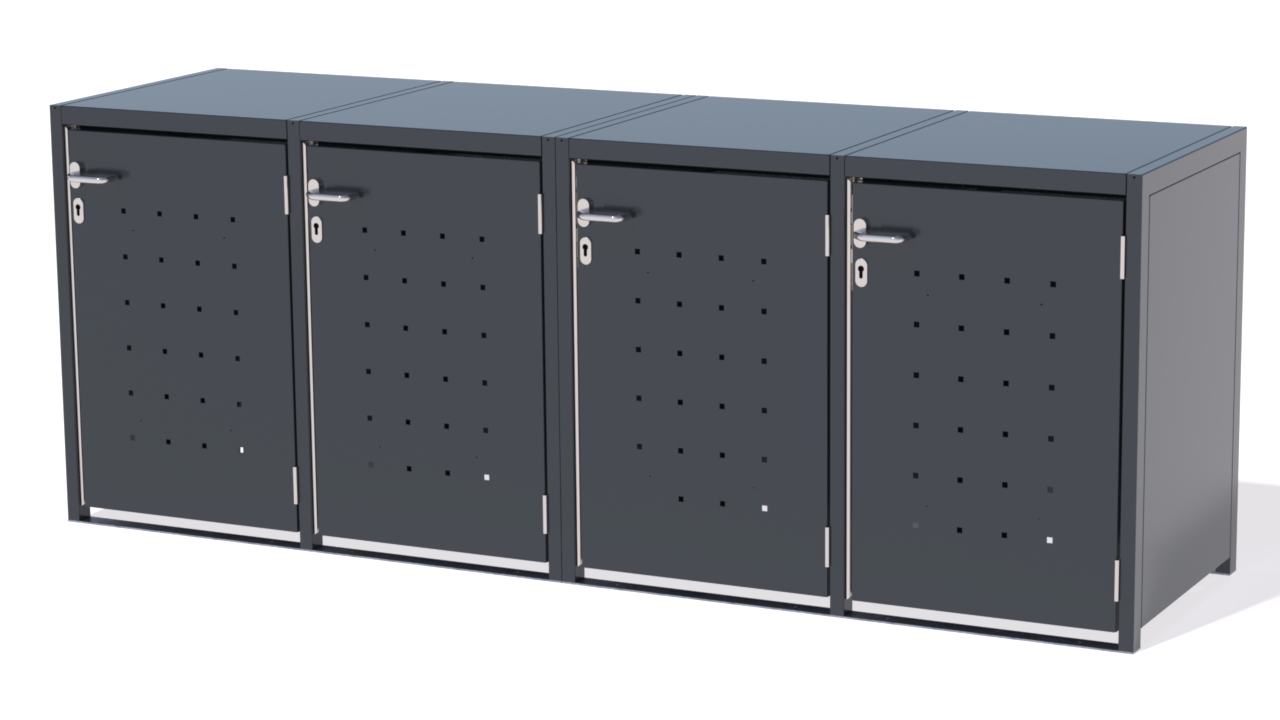 Die robusten Mülltonnenboxen aus feuerverzinktem, pulverbeschichtetem Stahl sind abschließbar, wetterfest und haben eine Türverkleidung mit der Quadratlochung. DIN EN 1090-zertifiziert, ideal für private oder gewerbliche Außenflächen, gefertigt in Deutschland.