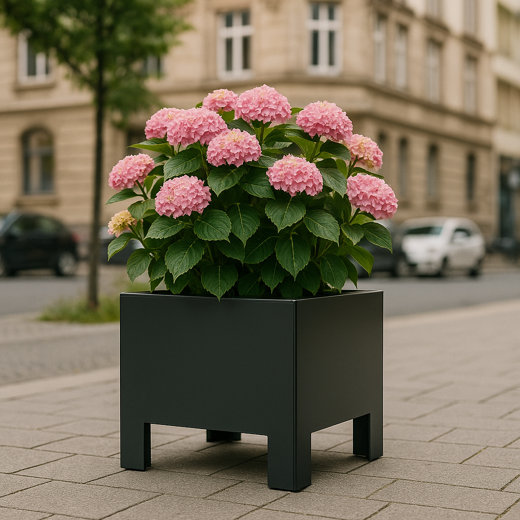 CEON Quadratische Pflanzenkübel aus 5 mm Stahlblech, feuerverzinkt nach DIN EN ISO 1461 und pulverbeschichtet, robust, formschön und korrosionsgeschützt. Mit Überlauf, verschliffenen Nähten sowie Stapler- und Kranaufnahme ideal für flexible Einsätze im öffentlichen oder gewerblichen Außenbereich.