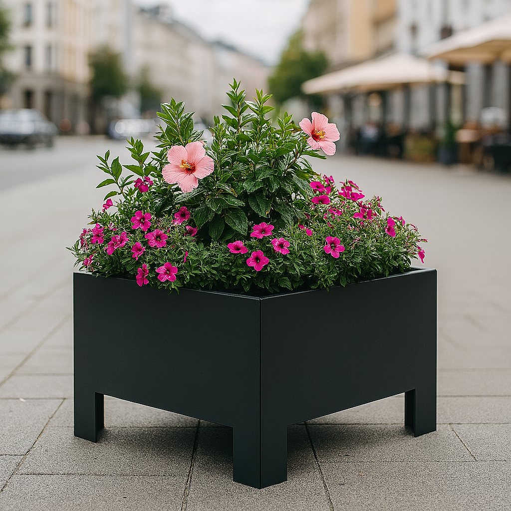 CEON Quadratische Pflanzenkübel aus 5 mm Stahlblech, feuerverzinkt nach DIN EN ISO 1461 und pulverbeschichtet, robust, formschön und korrosionsgeschützt. Mit Überlauf, verschliffenen Nähten sowie Stapler- und Kranaufnahme ideal für flexible Einsätze im öffentlichen oder gewerblichen Außenbereich.