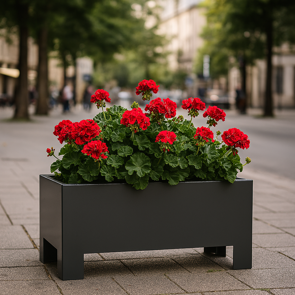CEON Rechteckiger Pflanzenkübel aus 5 mm Stahlblech, feuerverzinkt nach DIN EN ISO 1461 und pulverbeschichtet, robust, formschön und korrosionsgeschützt. Mit Überlauf, verschliffenen Nähten sowie Stapler- und Kranaufnahme ideal für flexible Einsätze im öffentlichen oder gewerblichen Außenbereich.