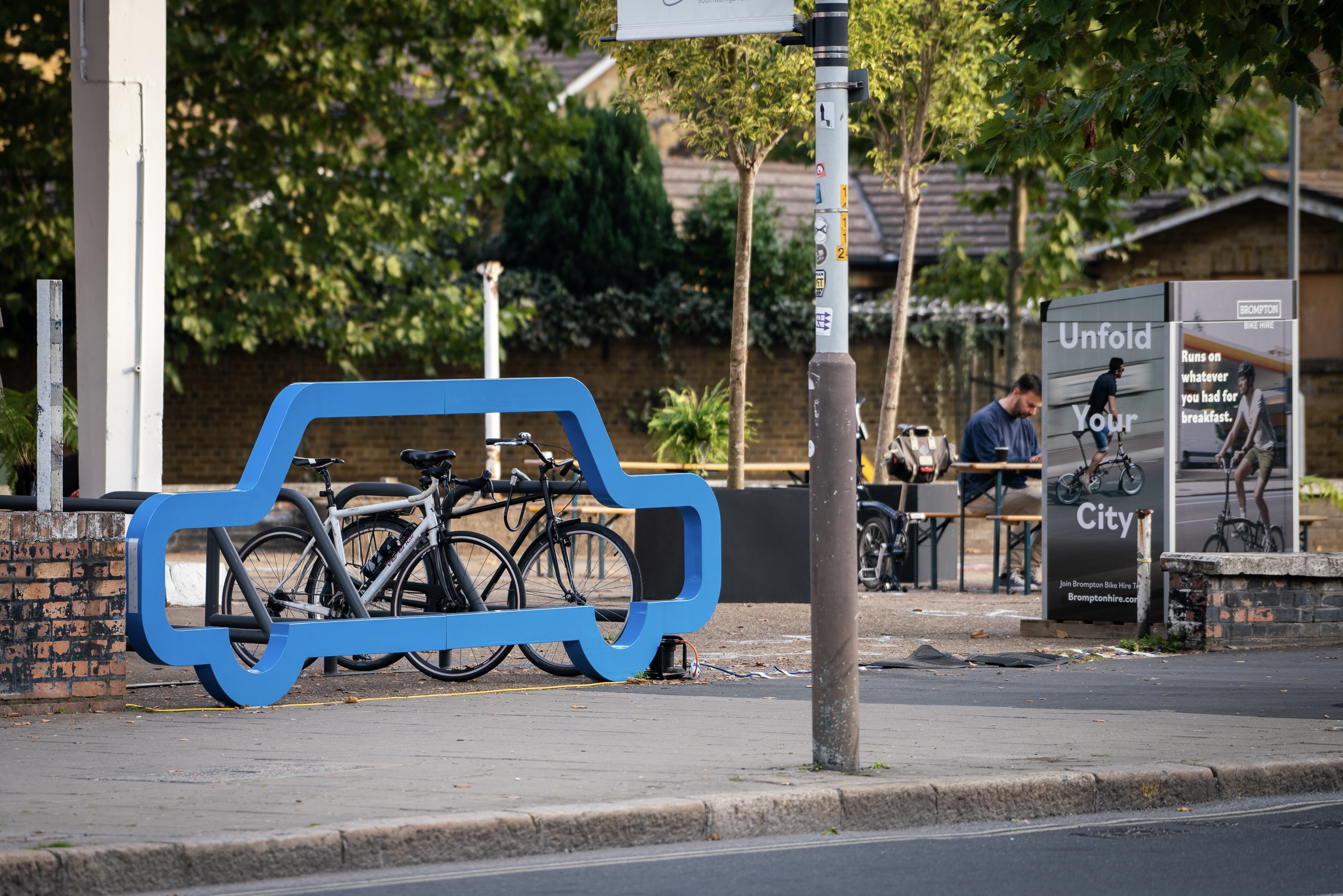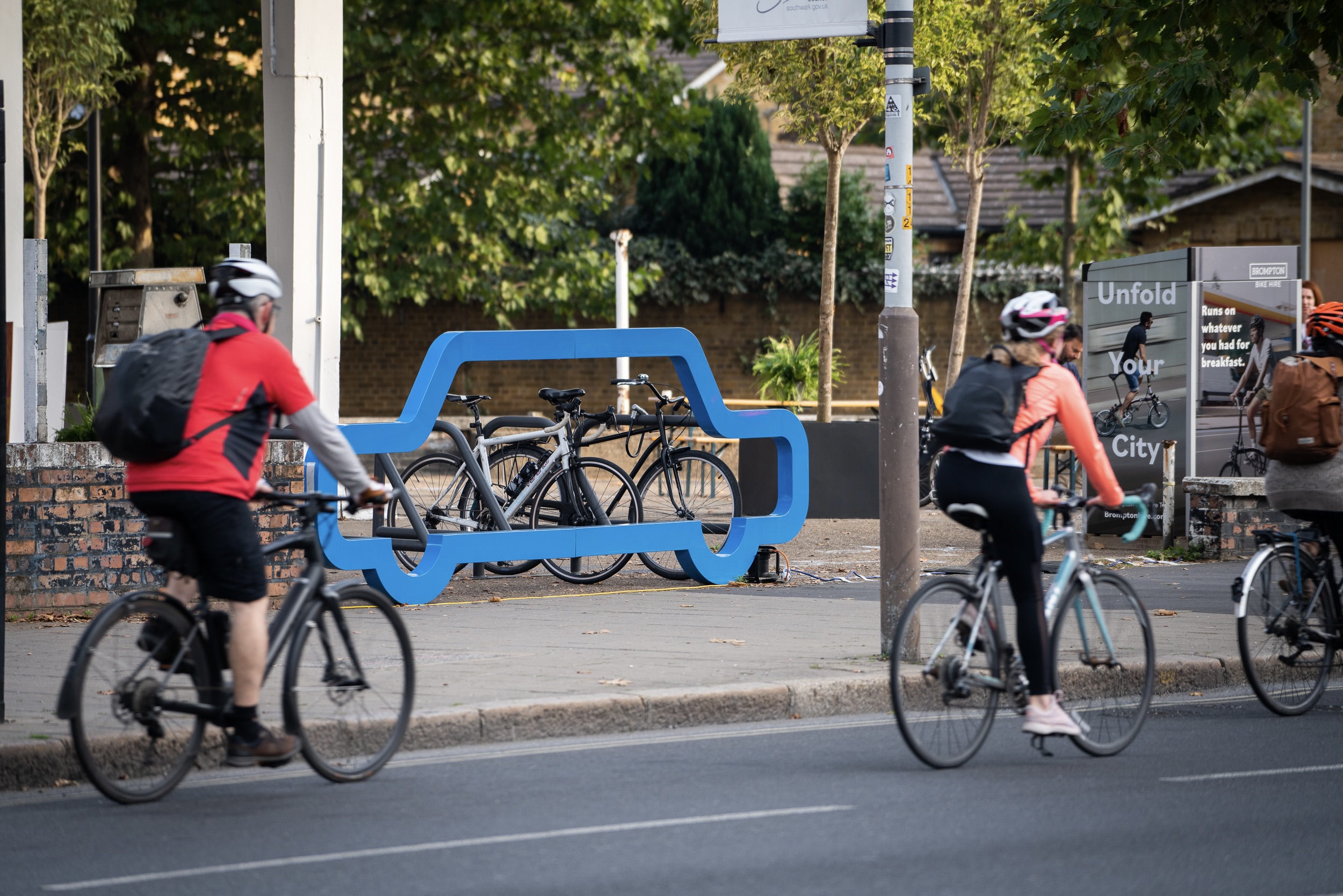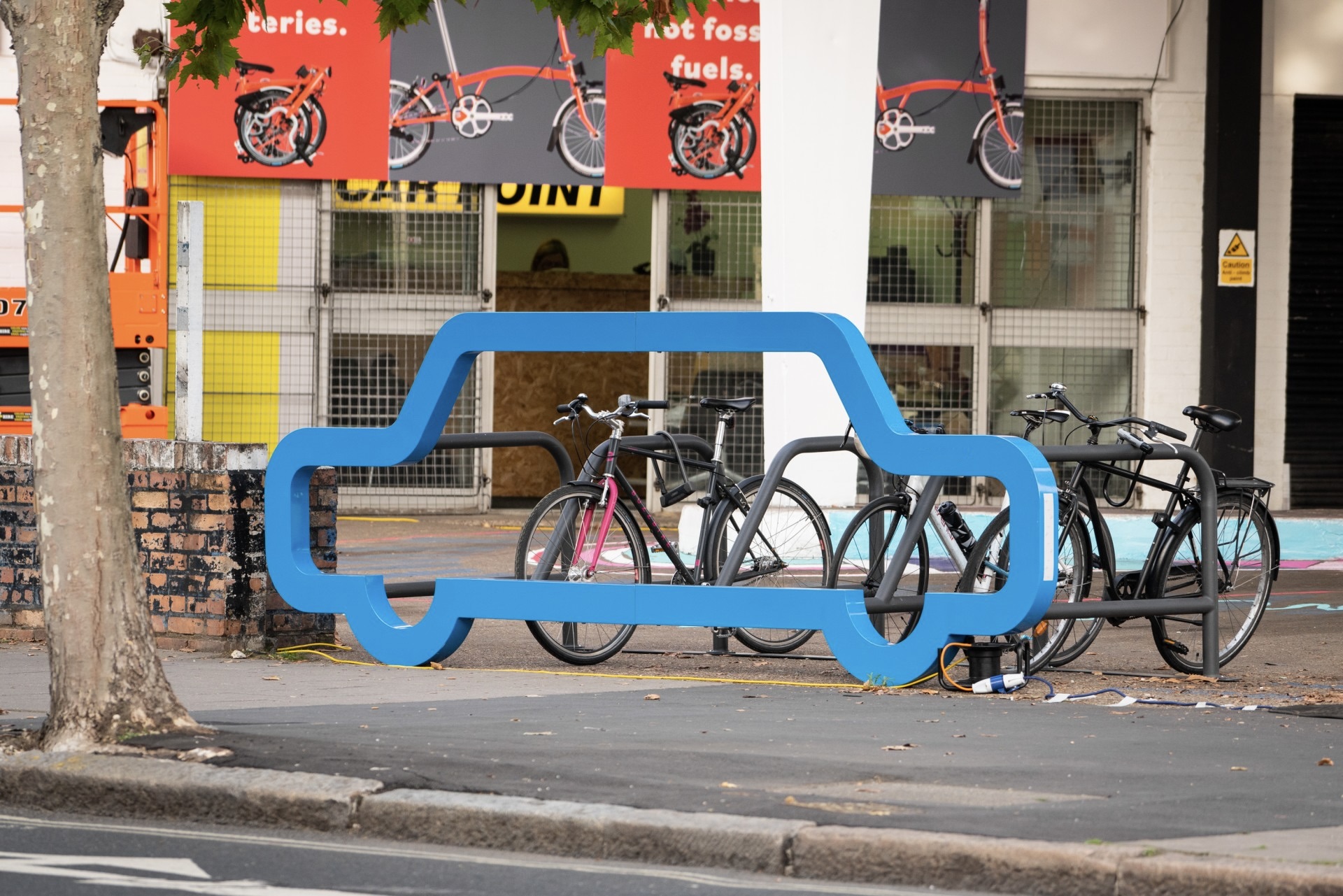 Die Autosilhouette als Blickfang vermittelt auf eindrucksvolle Weise den Gedanken der Platzersparnis durch Fahrradnutzung und fungiert zugleich als wirksame Parkplatzbarriere.