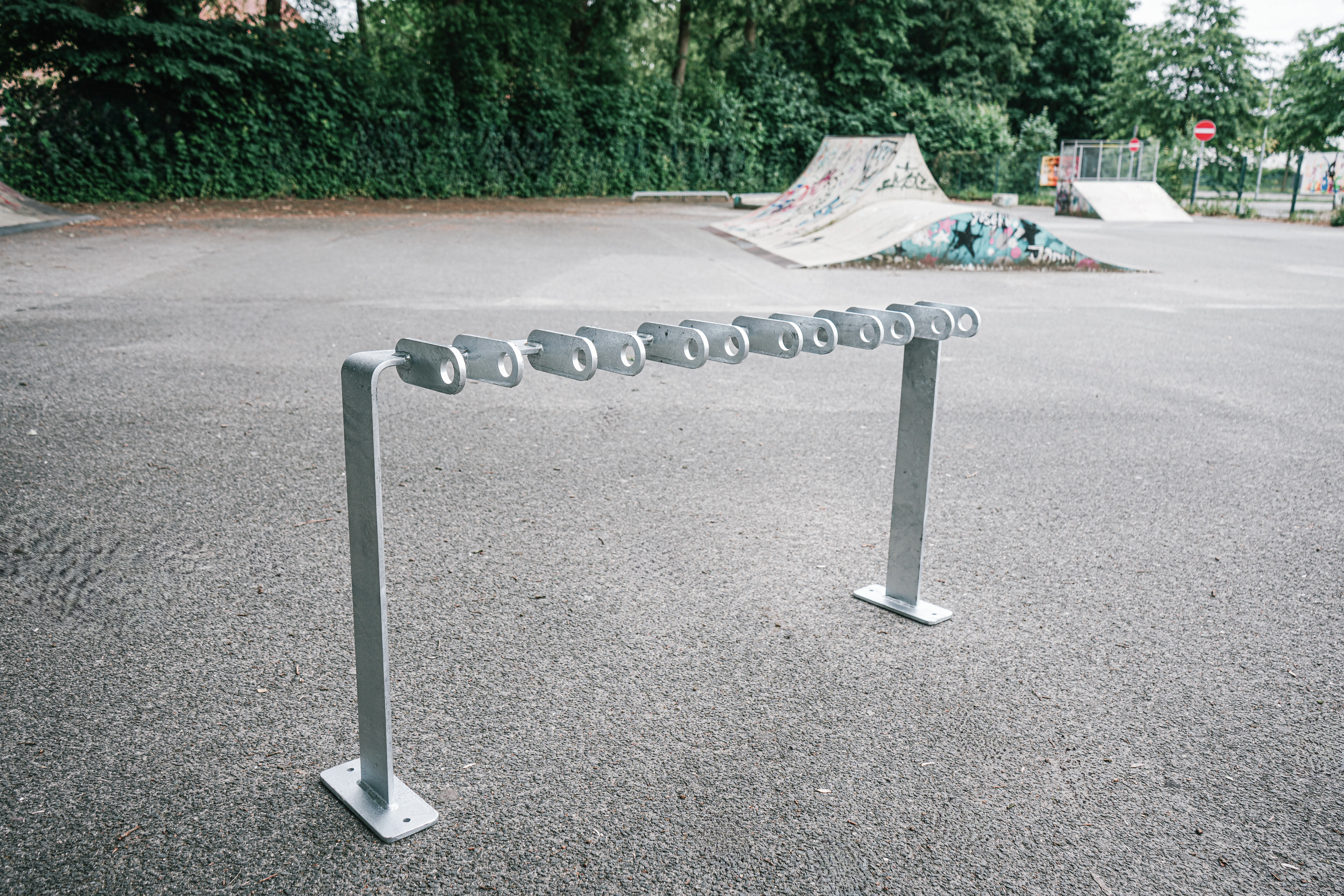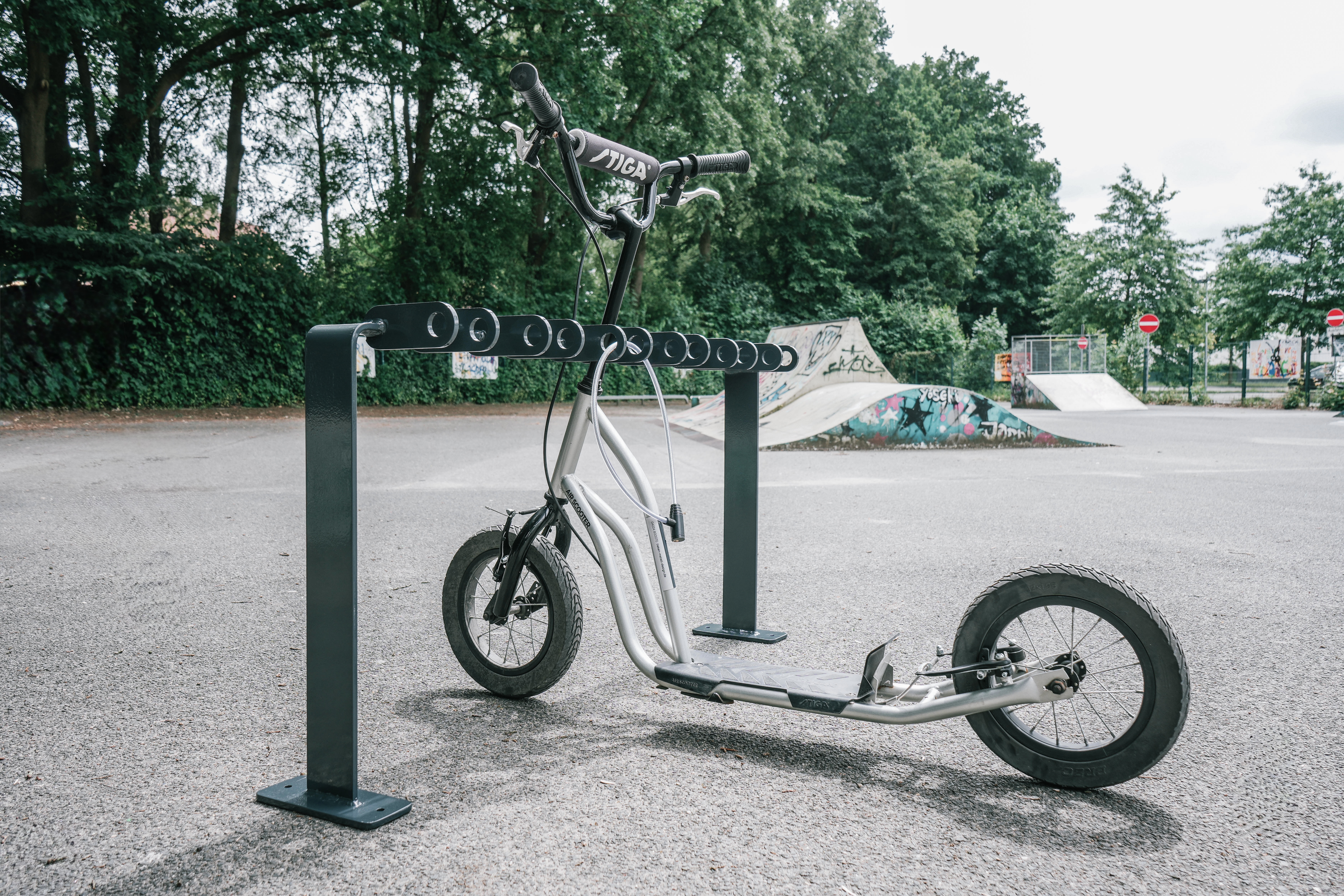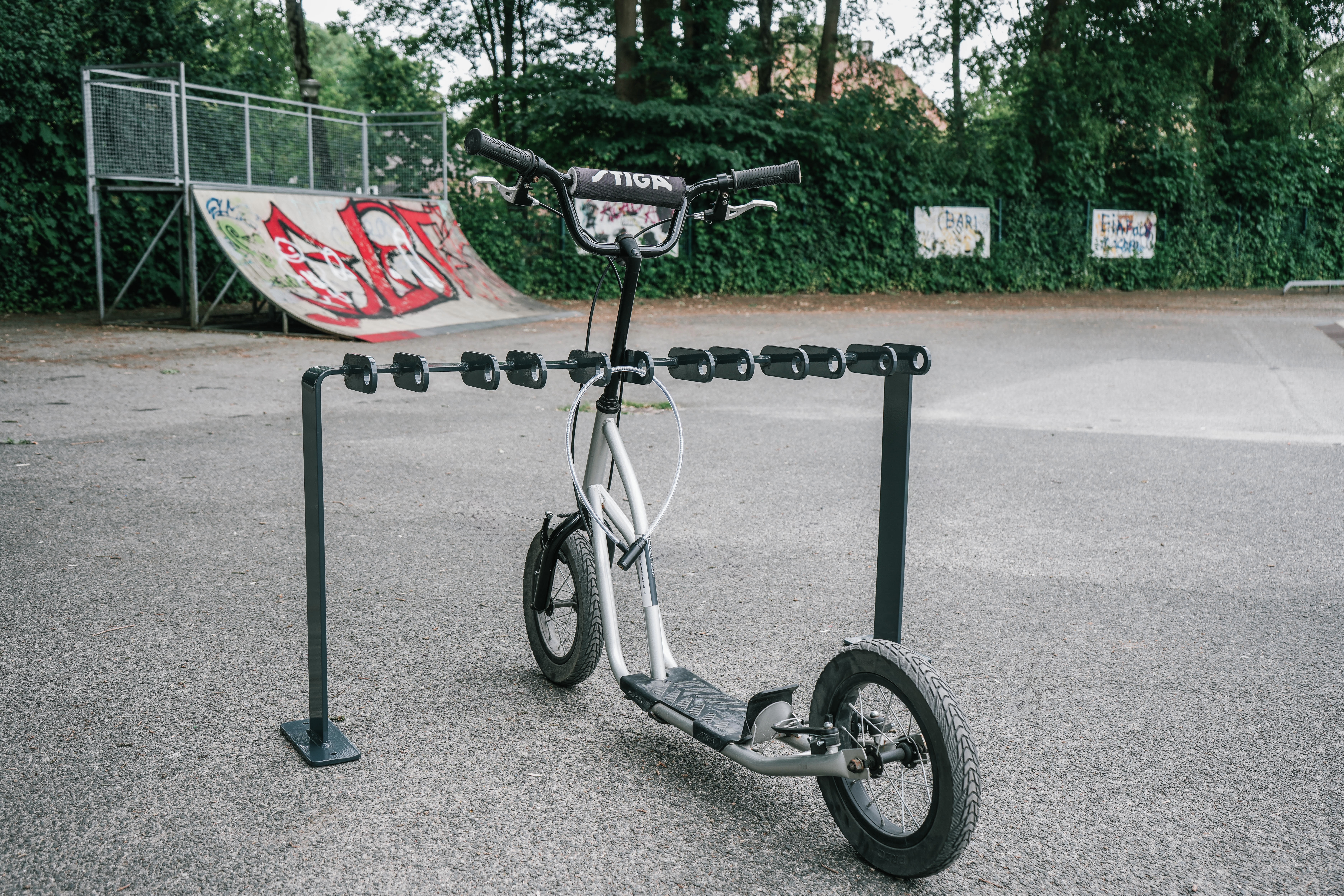 Erhältlich als 6er Modell für einseitige Nutzung oder als 12er Version für beidseitiges Abstellen bietet er die passende Lösung für unterschiedliche Nutzerzahlen. Eine langlebige und durchdachte Ergänzung, die für Ordnung sorgt und Tretrollern einen festen Platz gibt.