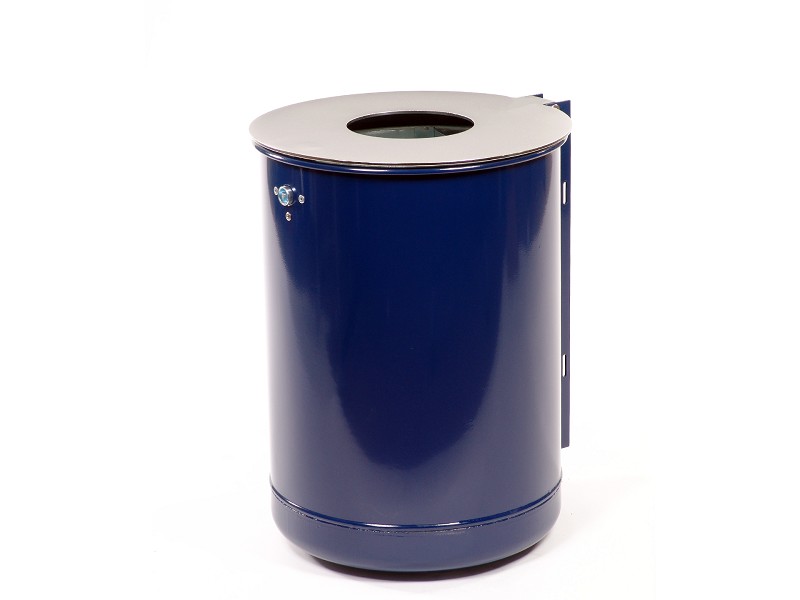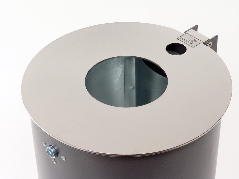 - Runder Abfallbehälter aus gelochtem oder glattem Stahlblech mit stabiler Abdeckung (Deckelscheibe).