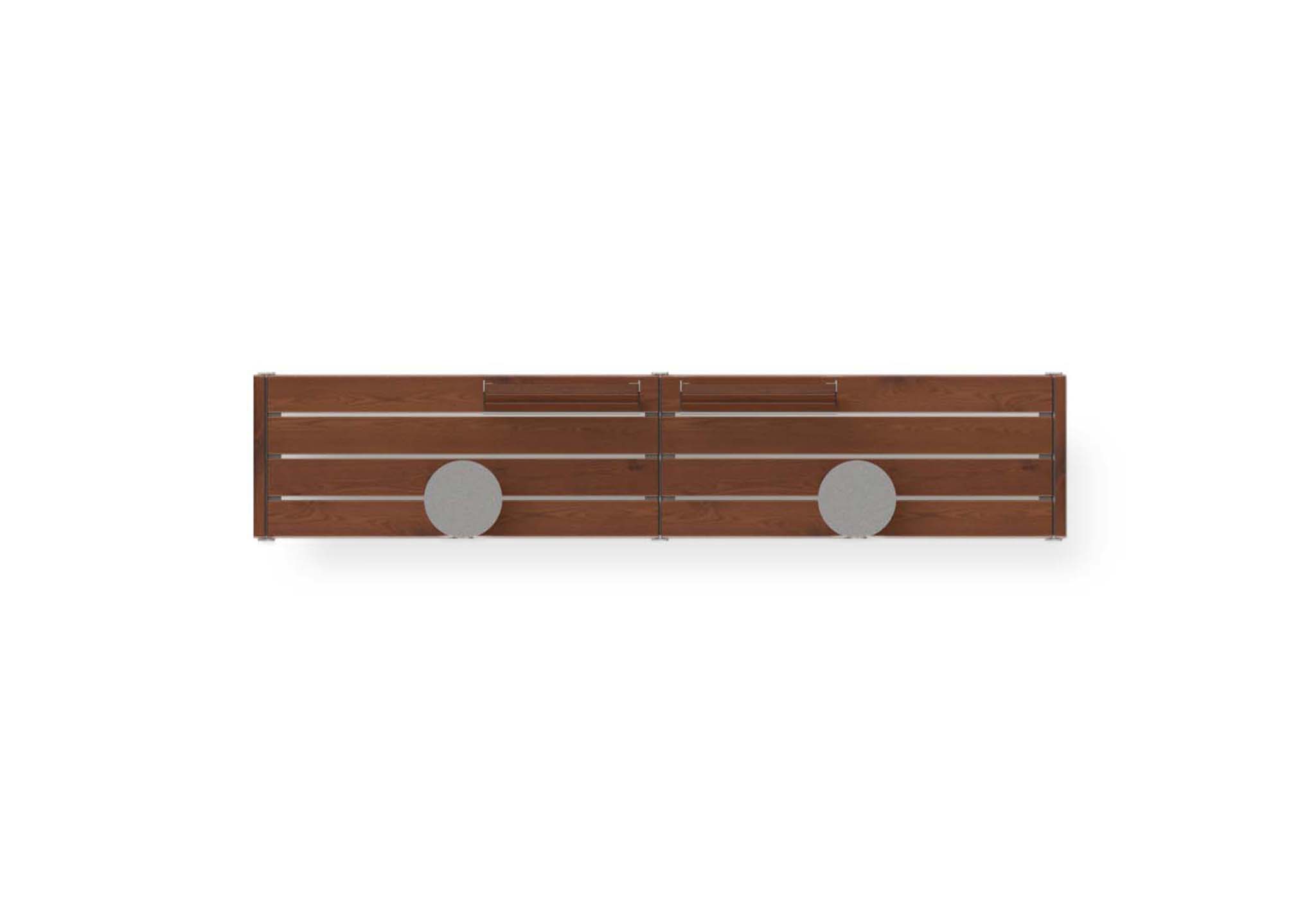 Besonders prägend für dieses Set sind die integrierten runden Ablageflächen an den Endbereichen der Anlage. Sie bieten praktische Abstellmöglichkeiten für Getränke, Taschen oder persönliche Gegenstände und erweitern die Funktion der Sitzbank über das reine Sitzen hinaus. Zusammen mit den mittig angeordneten Rückenlehnen entsteht eine abwechslungsreiche und zugleich aufgeräumte Sitzstruktur, die sich ideal für Plätze, Promenaden oder Aufenthaltsbereiche im urbanen Raum eignet.