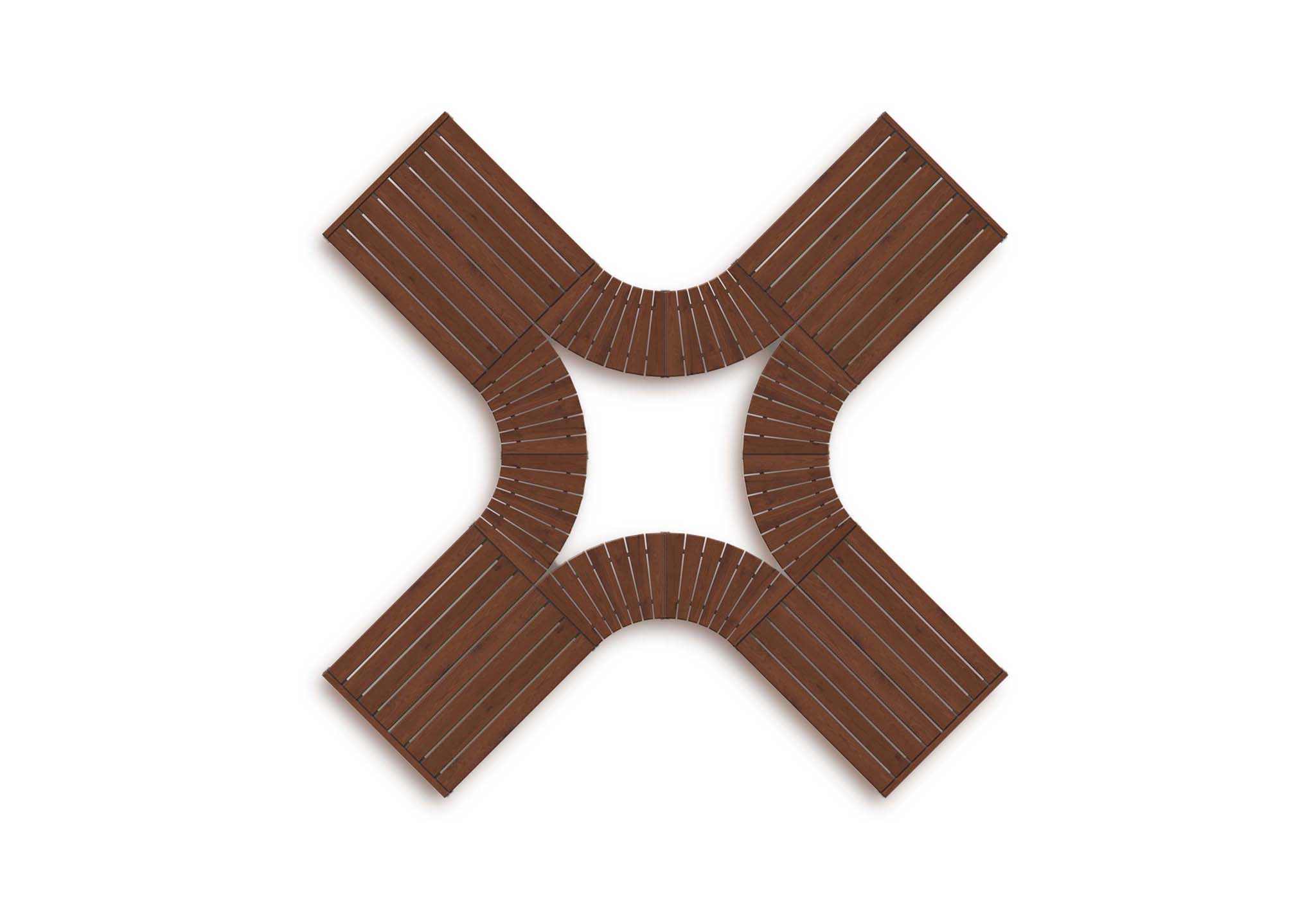 Charakteristisch für das Set ist die Kombination aus linearen Sitzflächen und gebogenen Verbindungselementen. Dadurch entstehen offene Sitzbereiche rund um eine zentrale Fläche, die Kommunikation und Begegnung fördert. Die Anordnung erlaubt eine Nutzung aus verschiedenen Richtungen und schafft gleichzeitig eine klare räumliche Struktur innerhalb größerer Freiflächen.