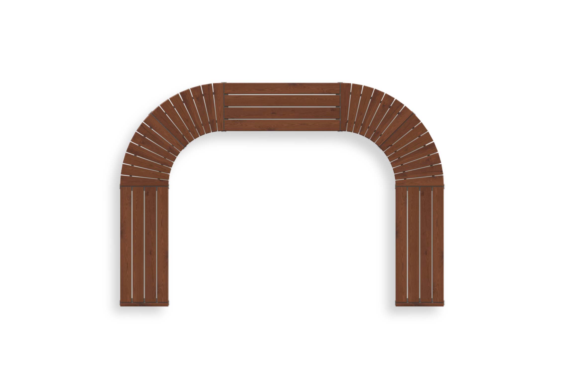 Die Gestaltung verbindet zwei gerade Sitzmodule mit einem gebogenen Mittelteil, wodurch eine gleichmäßige, fließende Form entsteht. Diese Anordnung ermöglicht unterschiedliche Sitzrichtungen und schafft eine kommunikative Atmosphäre innerhalb der Anlage. Der halbkreisförmige Aufbau lädt dazu ein, sich gegenüberzusitzen oder gemeinsam einen zentralen Bereich zu nutzen, wodurch das Set besonders für Treffpunkte und Aufenthaltsflächen geeignet ist.