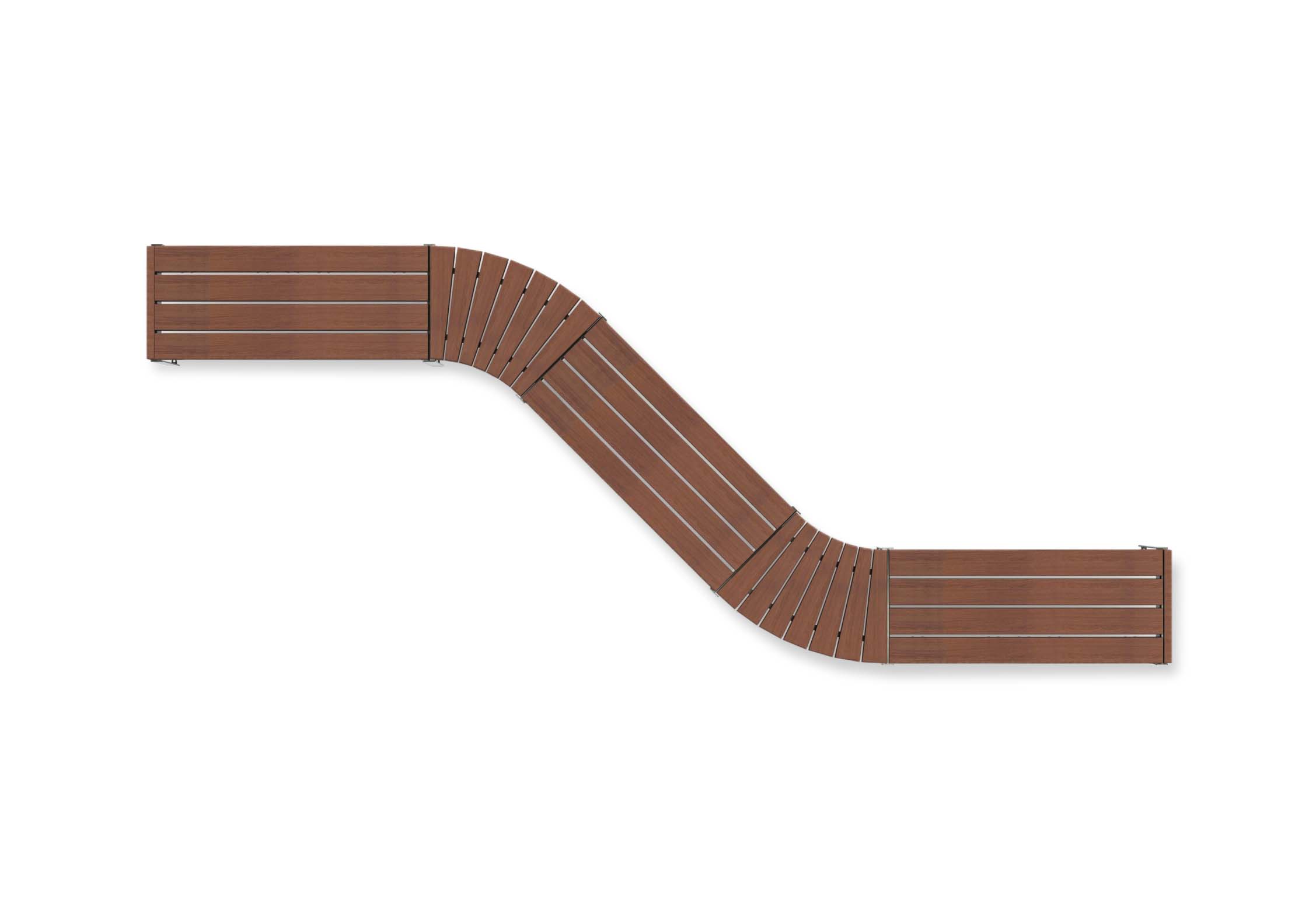 Die Gestaltung kombiniert zwei gerade Sitzmodule mit einem zentralen Verbindungselement, das über sanfte Kurven eine Richtungsänderung der Bank erzeugt. Dadurch entsteht eine abwechslungsreiche Sitzstruktur, die verschiedene Blickrichtungen und Sitzpositionen ermöglicht. Die Form wirkt offen und einladend und schafft gleichzeitig eine klare räumliche Gliederung innerhalb von Plätzen oder Grünanlagen.