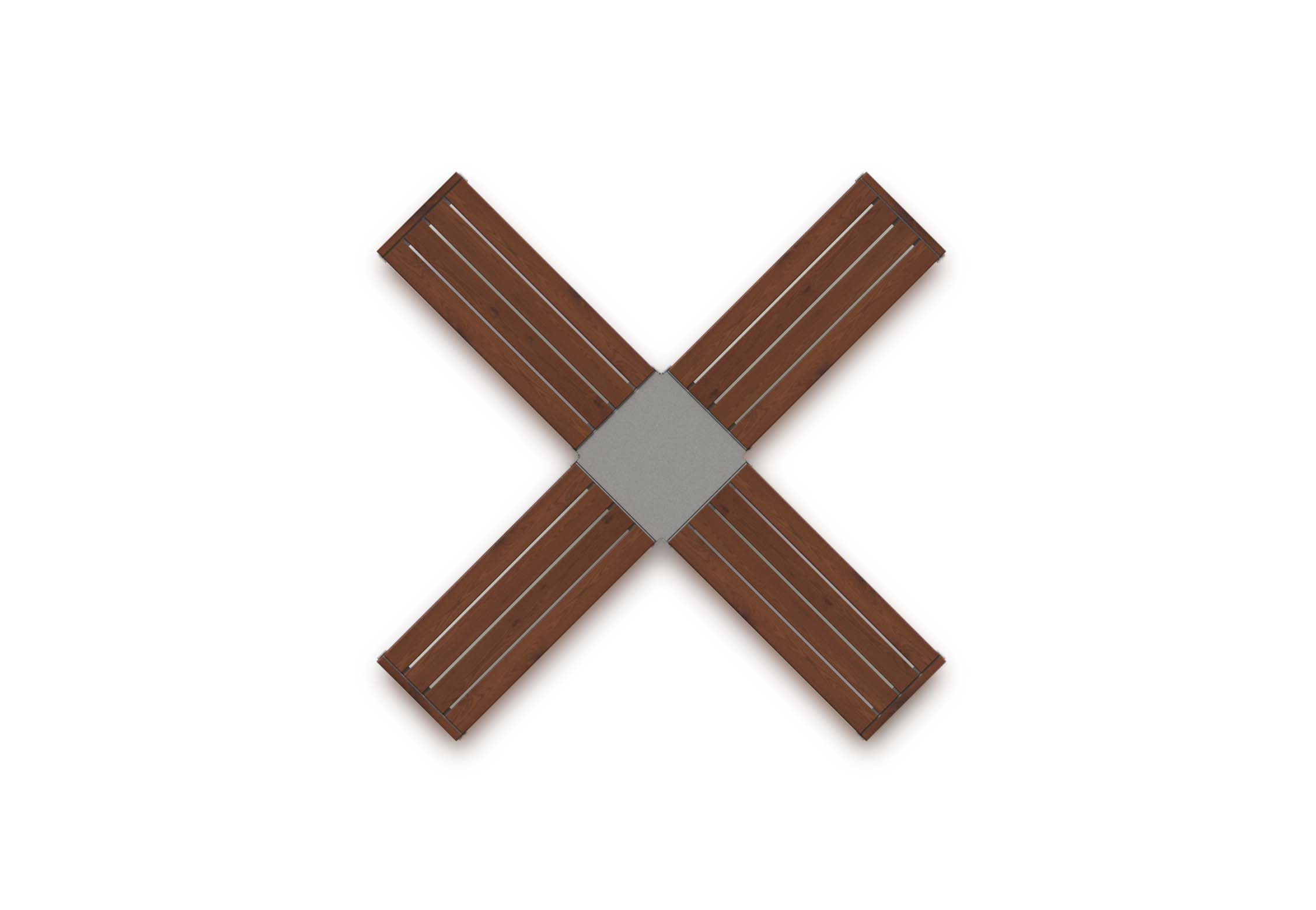 Durch die kreuzförmige Gestaltung entstehen mehrere Sitzrichtungen, sodass Nutzer die Bank aus verschiedenen Perspektiven nutzen können. Diese offene Anordnung fördert Begegnung und Kommunikation und eignet sich besonders für Plätze, Innenhöfe oder Grünanlagen, in denen sich Menschen aus unterschiedlichen Richtungen treffen und verweilen.