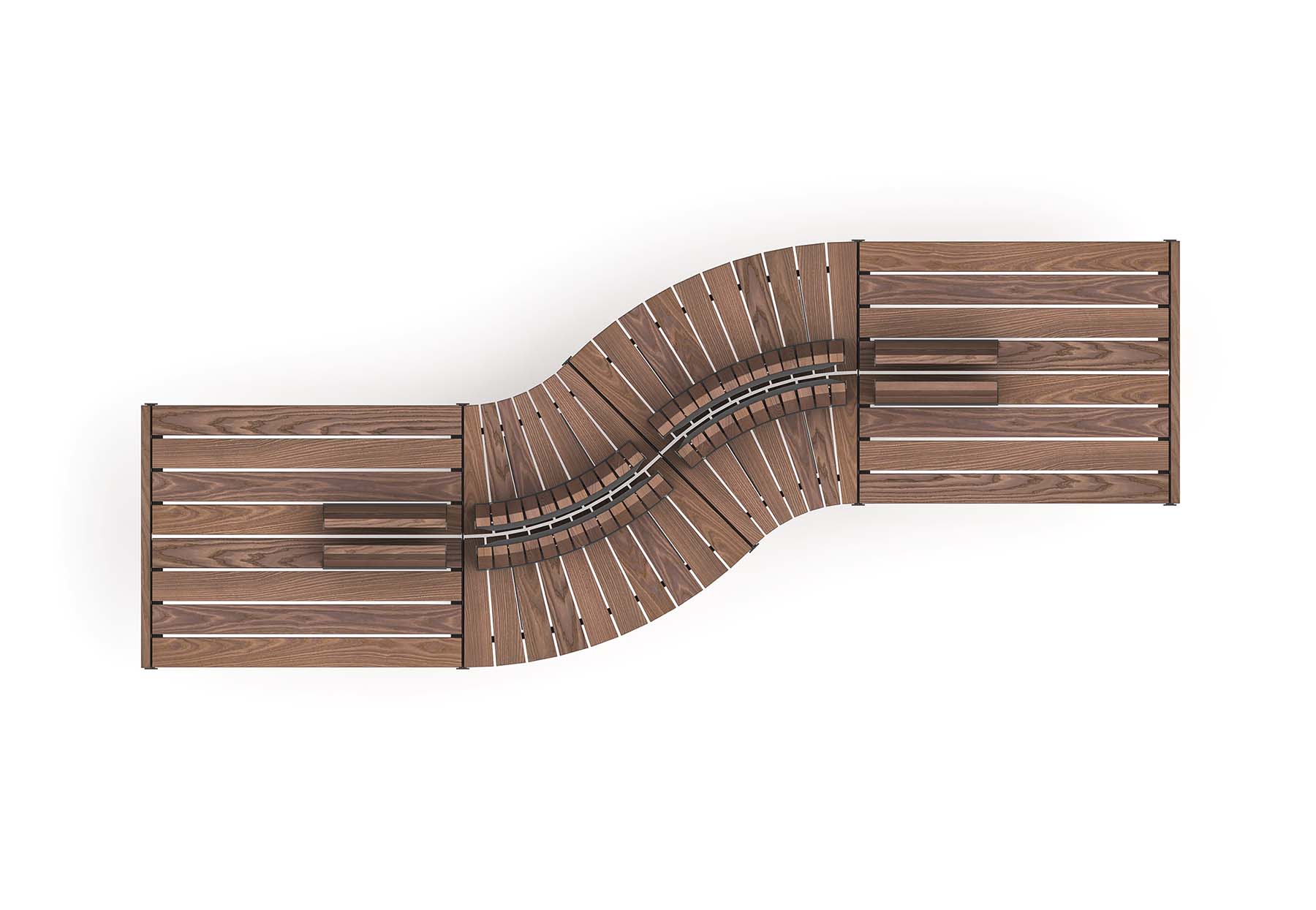 Der geschwungene Mittelteil schafft eine kommunikative Sitzsituation und sorgt für unterschiedliche Blickrichtungen und Sitzpositionen. Ergänzende Rückenlehnen erhöhen den Komfort und strukturieren die Sitzbereiche entlang der Anlage. Durch diese Kombination aus geraden und organisch geformten Elementen entsteht eine moderne, lebendige Gestaltung, die sich besonders gut für Plätze, Promenaden oder Aufenthaltsbereiche mit hoher Besucherfrequenz eignet.