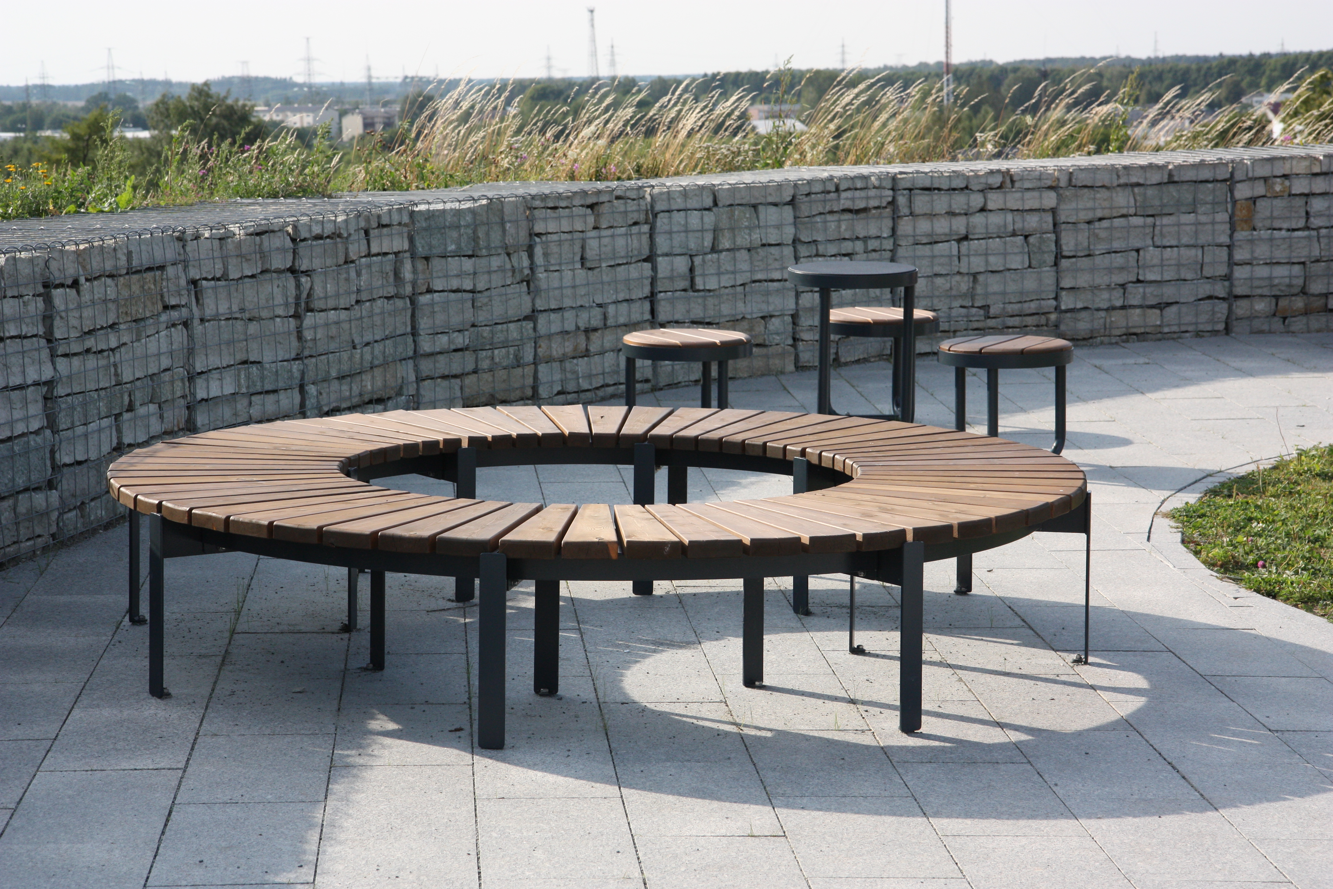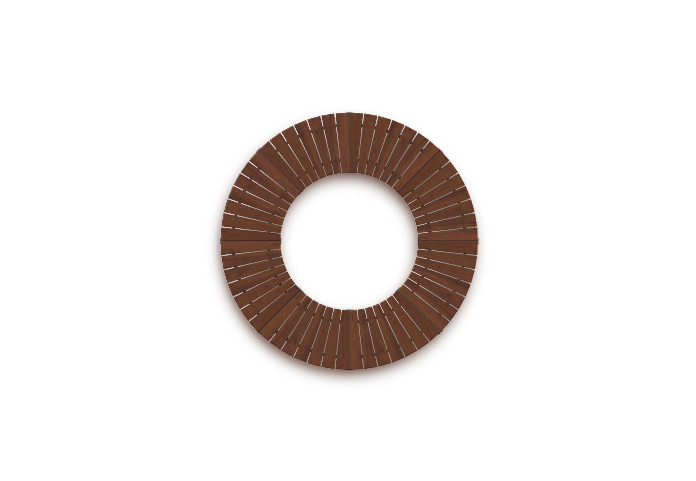 Die gleichmäßig angeordneten Sitzsegmente bilden eine harmonische und ruhige Gesamtform. Durch die runde Gestaltung können mehrere Personen gleichzeitig Platz nehmen, ohne dass eine feste Sitzrichtung vorgegeben ist. Dadurch entsteht eine offene und kommunikative Sitzsituation, die sowohl für kurze Pausen als auch für längere Aufenthalte geeignet ist und sich flexibel in verschiedene Freiraumkonzepte integrieren lässt.