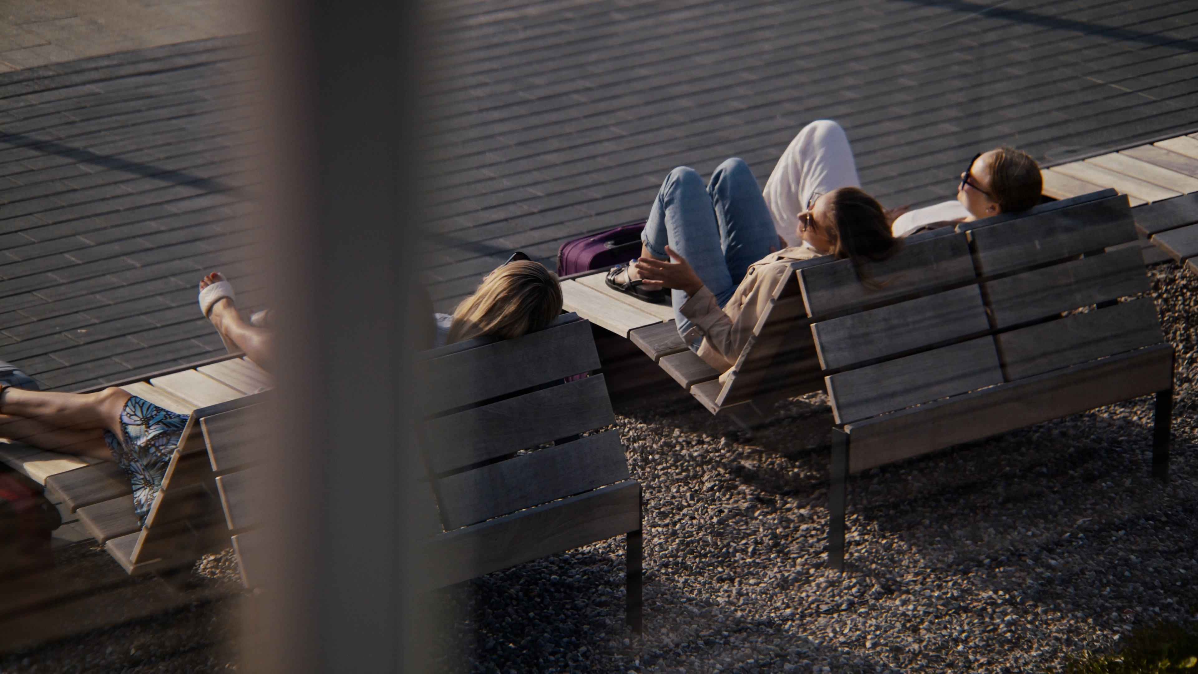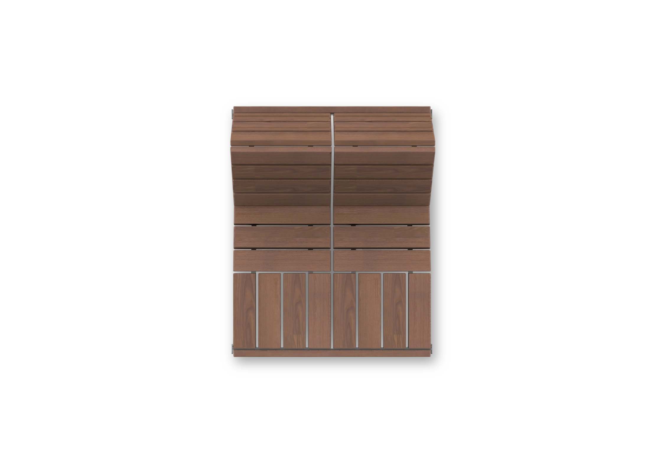 Die Gestaltung besticht durch ihre klare Geometrie und die markanten Rückenlehnen. Die zentrale Plattform lädt zum entspannten Verweilen, Ausruhen oder sogar Liegen ein und fördert so eine offene und kommunikative Atmosphäre. Gleichzeitig sorgt die kompakte Anordnung der Module für eine ruhige und architektonisch ansprechende Gesamtwirkung.