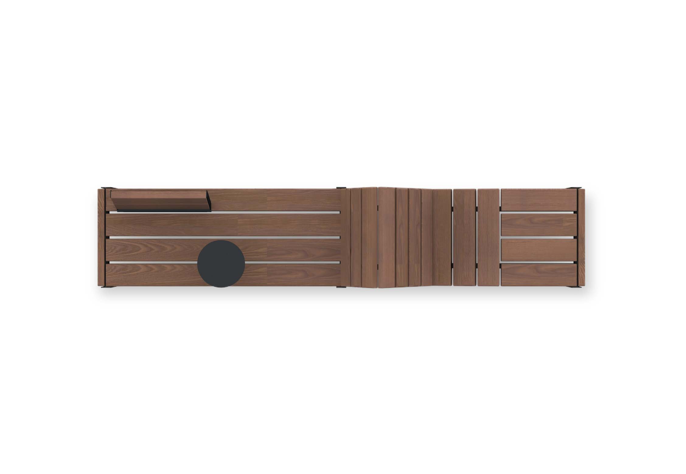 Die Gestaltung lebt vom Wechsel zwischen geraden Sitzmodulen und dem geneigten Mittelteil der Liegebank. Während die äußeren Bereiche als komfortable Sitzbank dienen, lädt das mittlere Modul zum entspannten Liegen und Ausruhen ein. Die ergänzte Rückenlehne bietet zusätzliche Unterstützung beim Sitzen, während der integrierte Tisch eine praktische Ablagefläche für Getränke, Bücher oder persönliche Gegenstände schafft und die Anlage zu einem kommunikativen Treffpunkt macht.