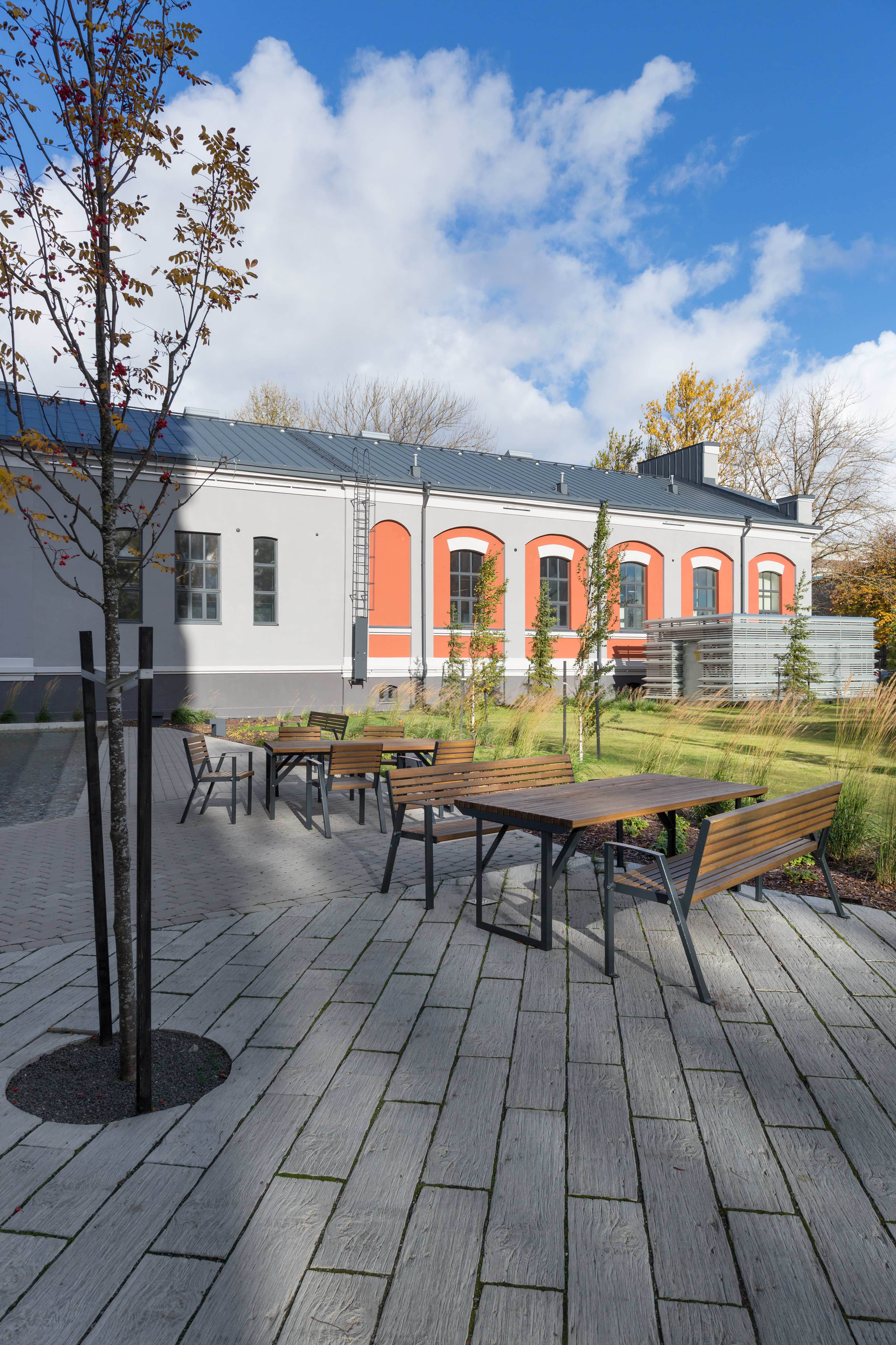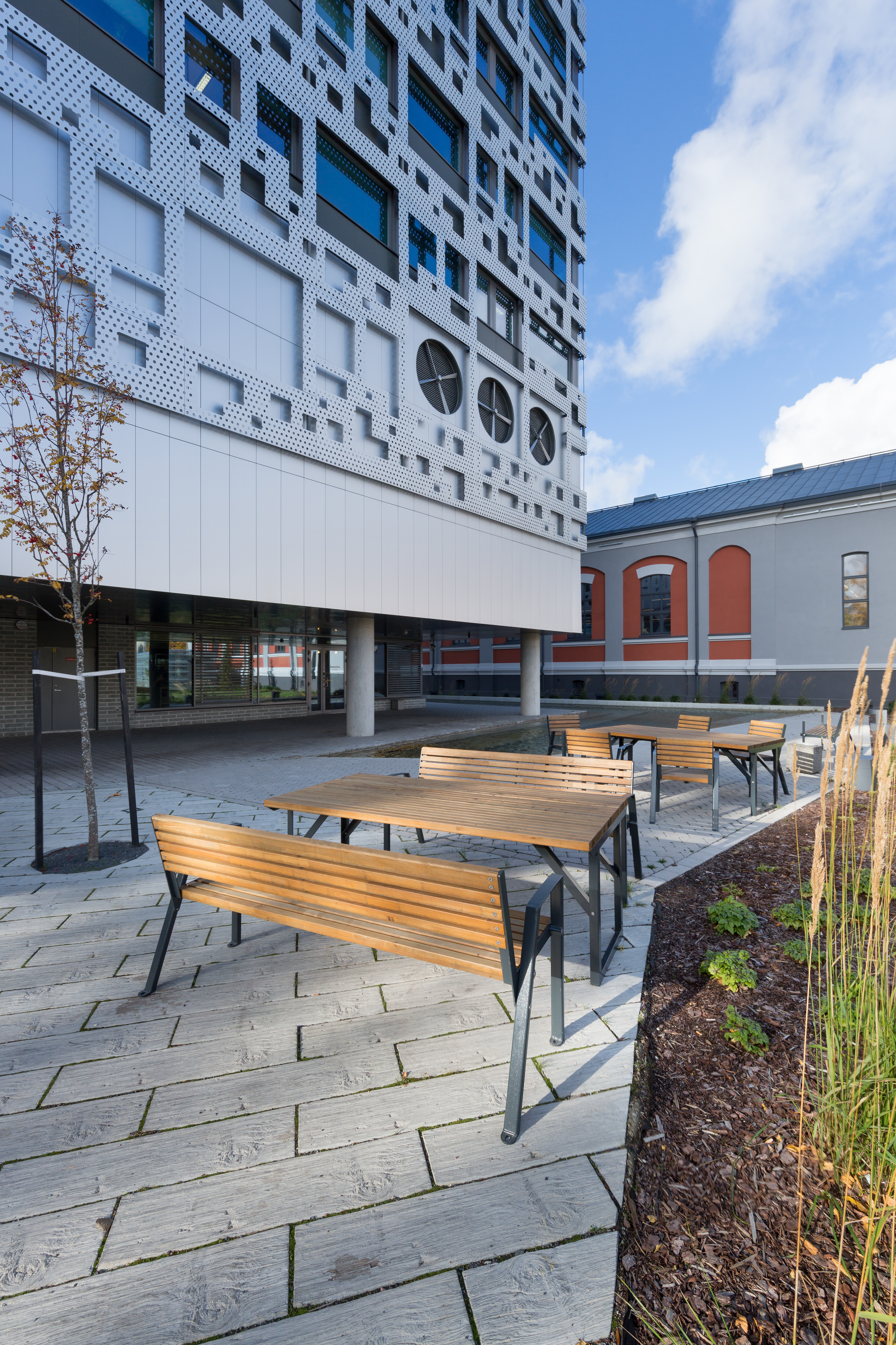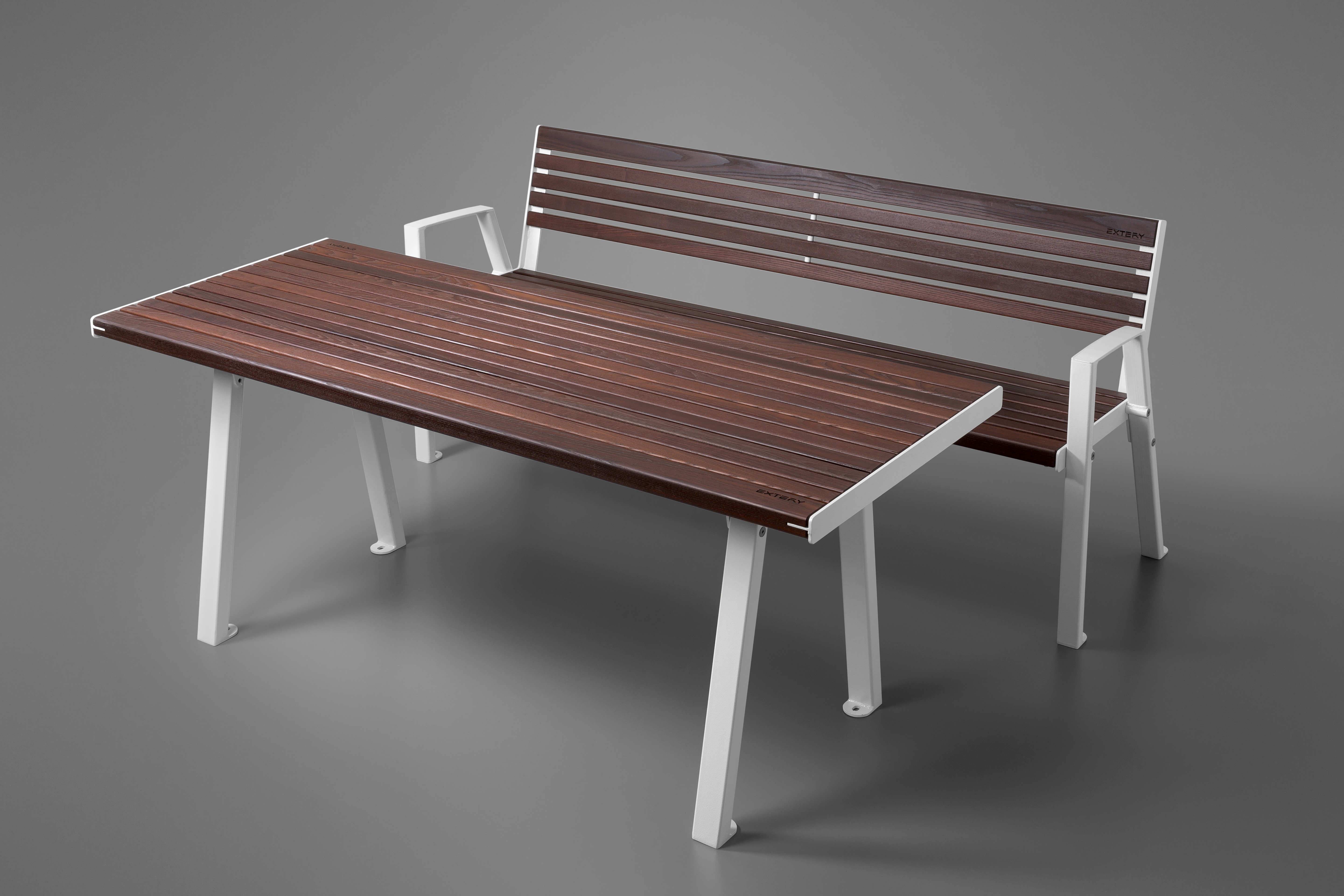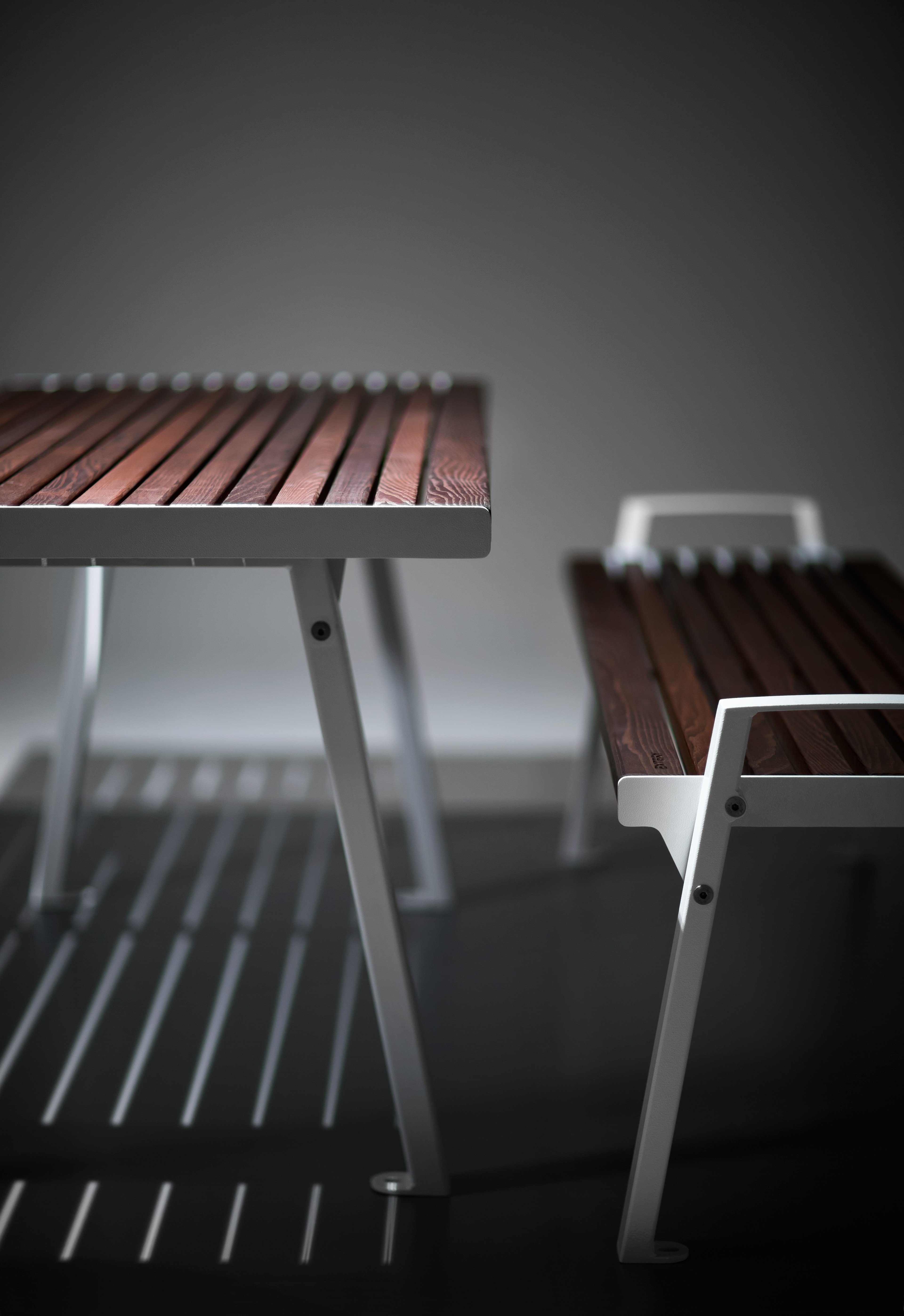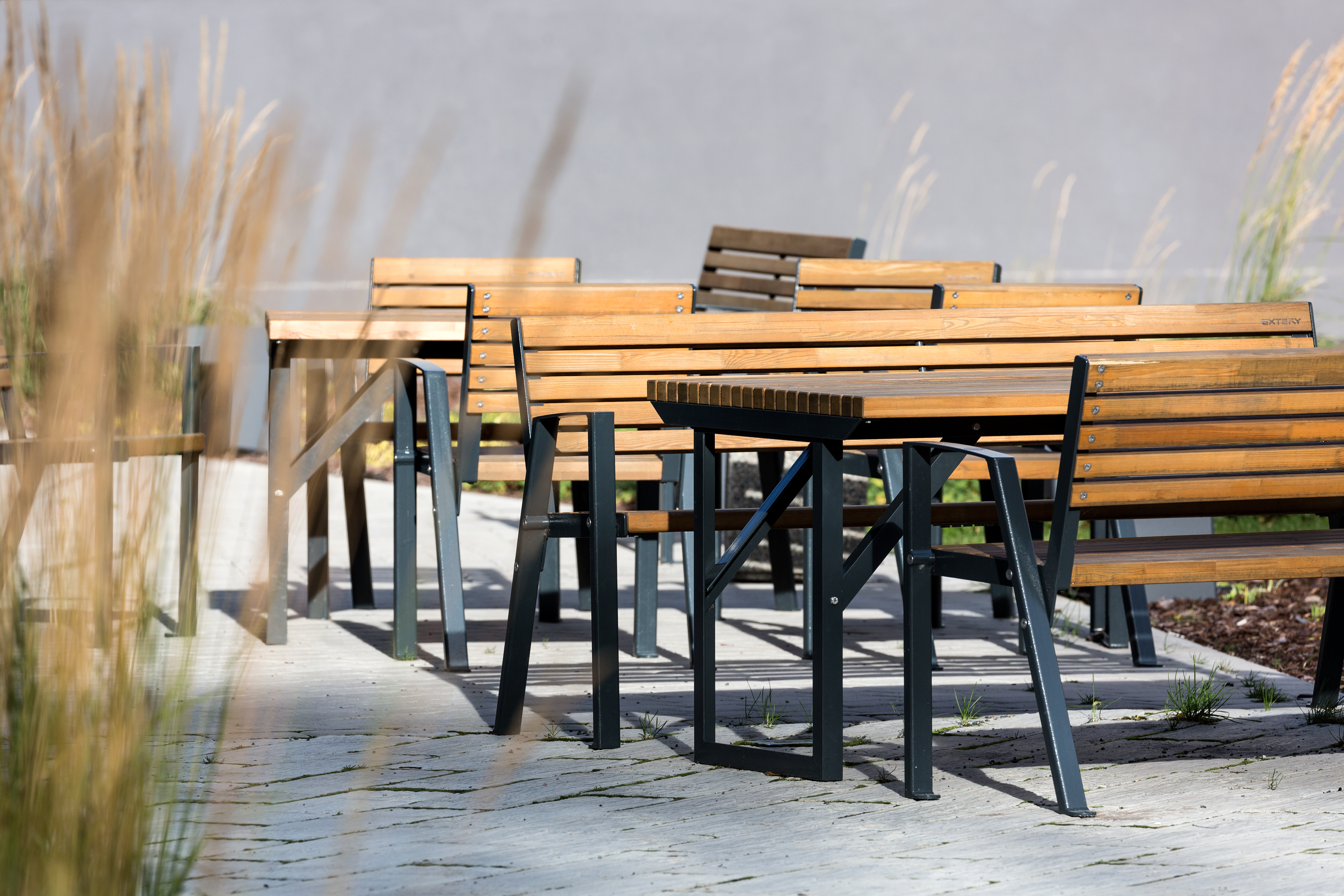 Der KLAAR Wood Tisch verbindet klare Architektur mit robuster Stahlkonstruktion und natürlicher Holzoptik. Eine langlebige Lösung für moderne und funktionale Aufenthaltsbereiche im Außenraum.