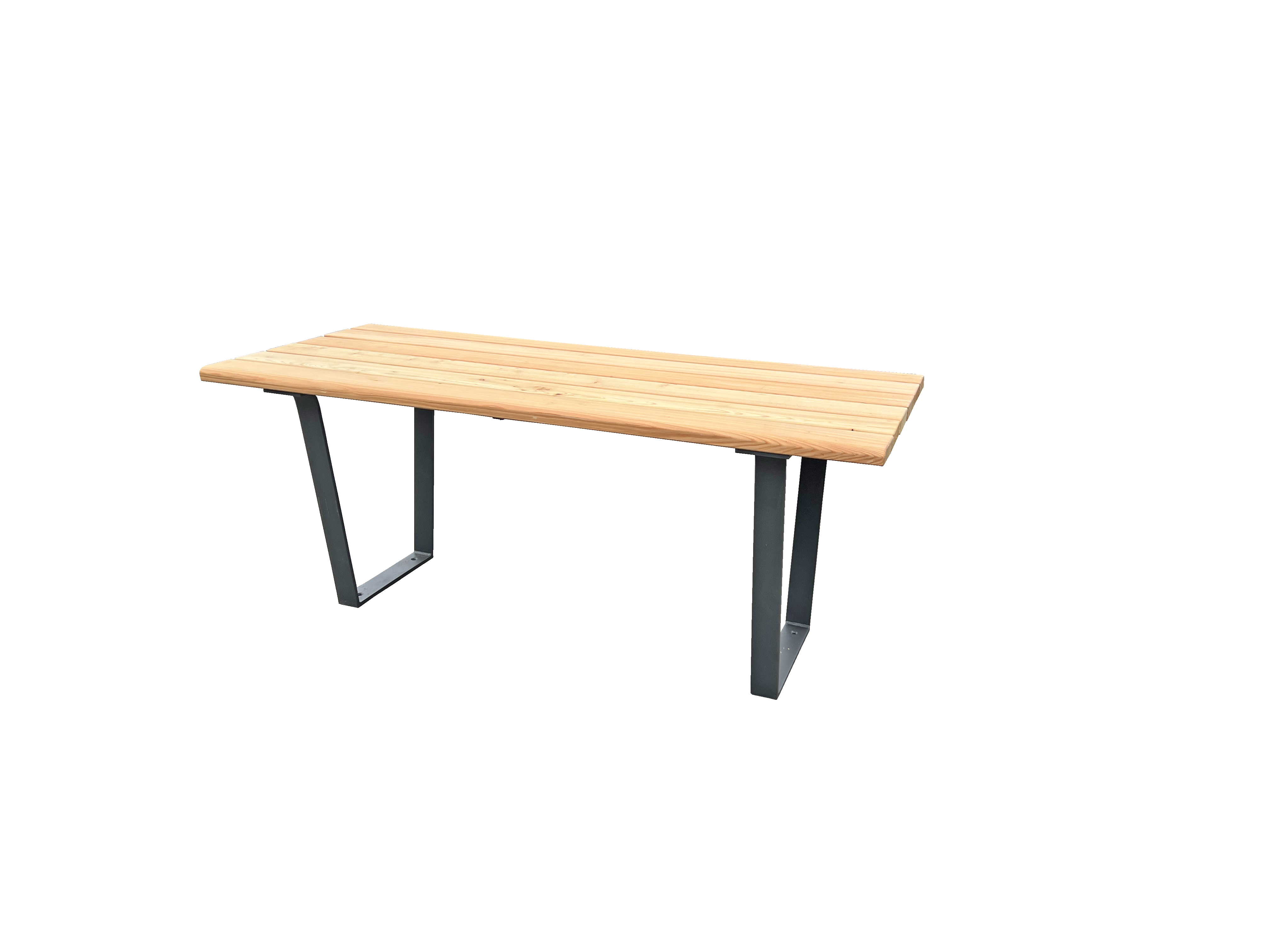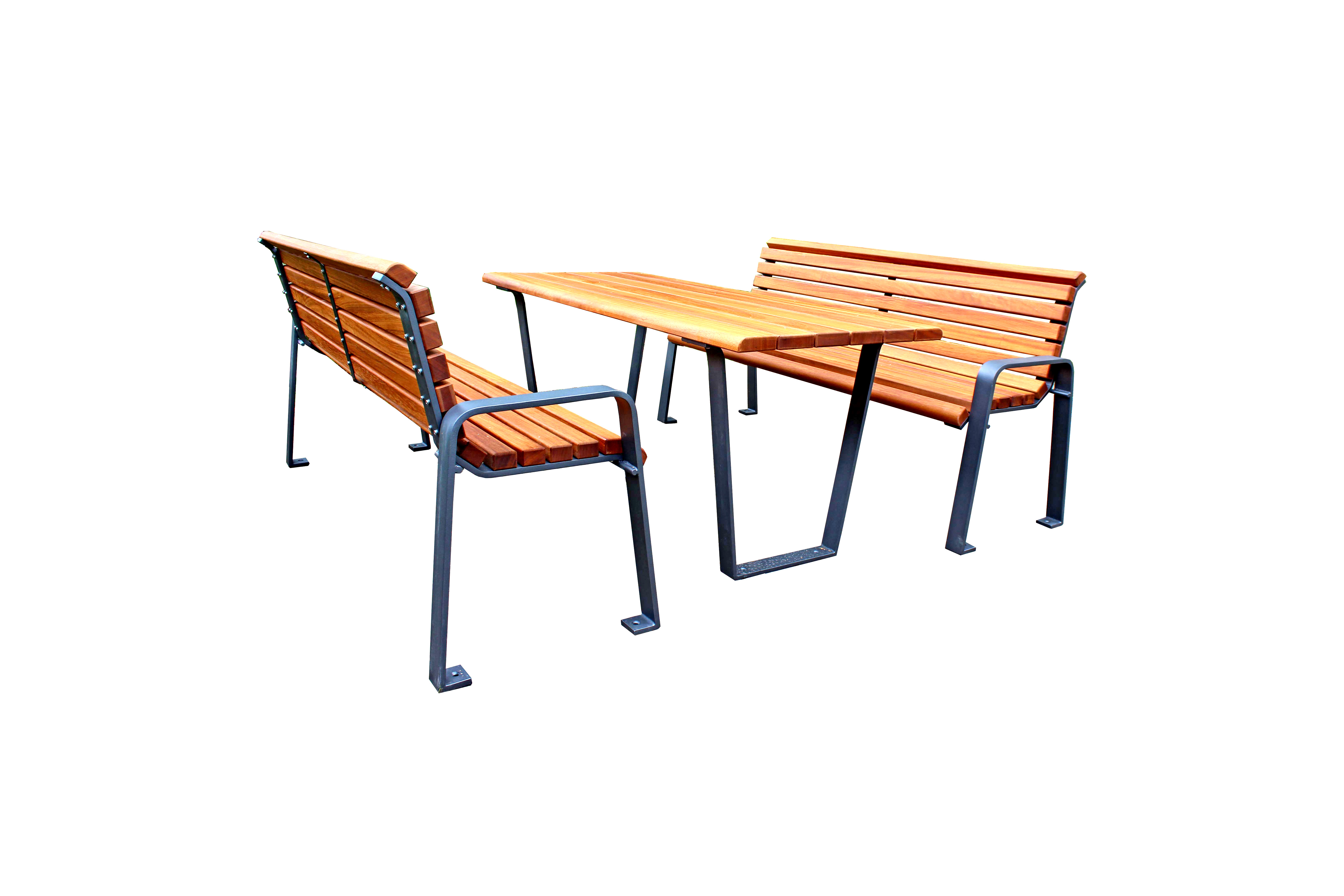 Erhältlich als Hocker, Bank mit Lehne und passender Tisch – ideal für barrierefreie Außenbereiche.Stabiles, pulverbeschichtetes Flachstahl-Gestell mit stark gerundeten Abschlusslatten für mehr Sicherheit und Langlebigkeit.