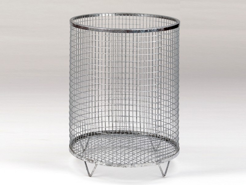 - Klassischer, runder Abfallkorb aus verzinktem Drahtgitter, ideal für Parkanlagen, Rastplätze oder öffentliche Freiflächen.