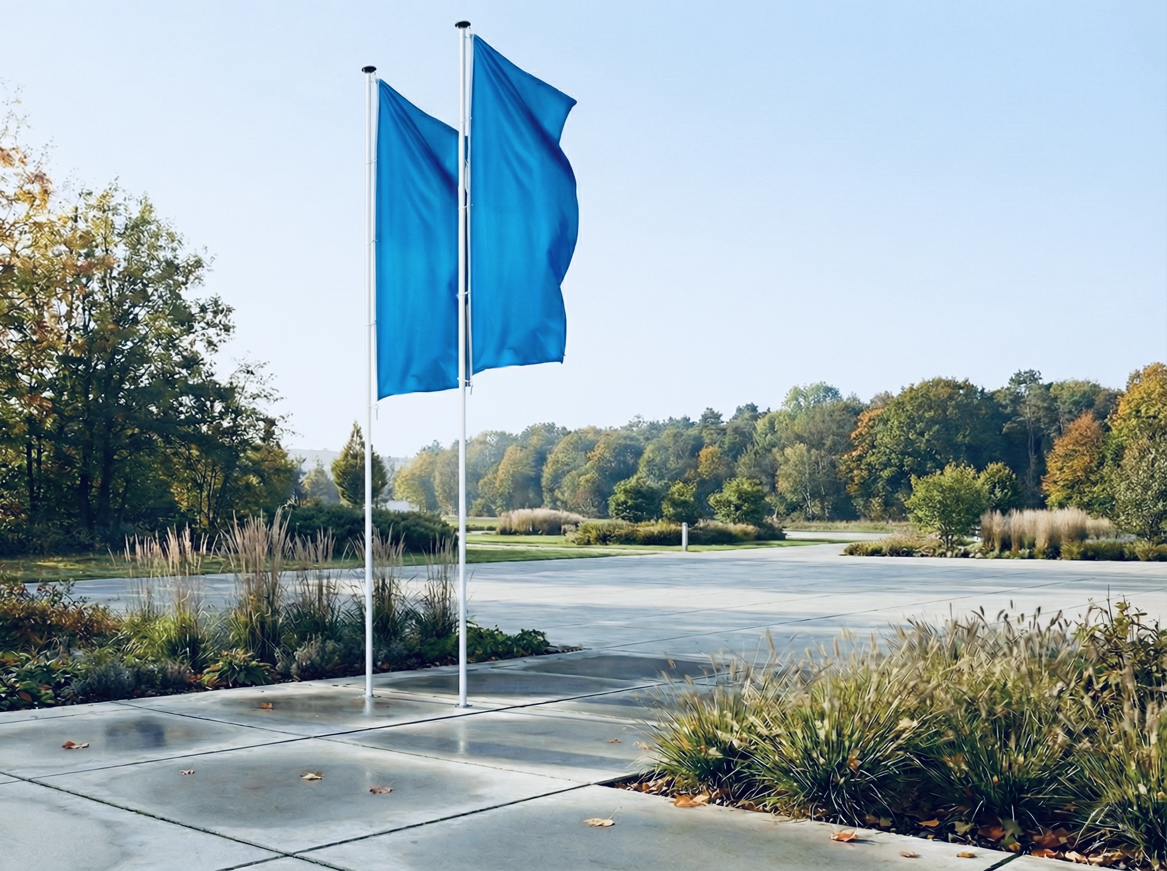 Zylindrischer Fahnenmast mit innenliegender Hissvorrichtung und Sicherheits-Seilklemme.