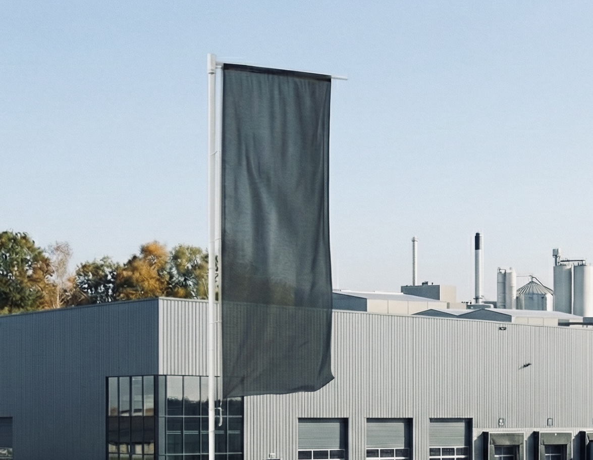 Befestigung Tuch: Vertikale Fahnentuchführung durch Gurtschlaufen am Mast. Gewichtspack gegen Hochwehen der Fahne am Mast und für leichtes Einholen.