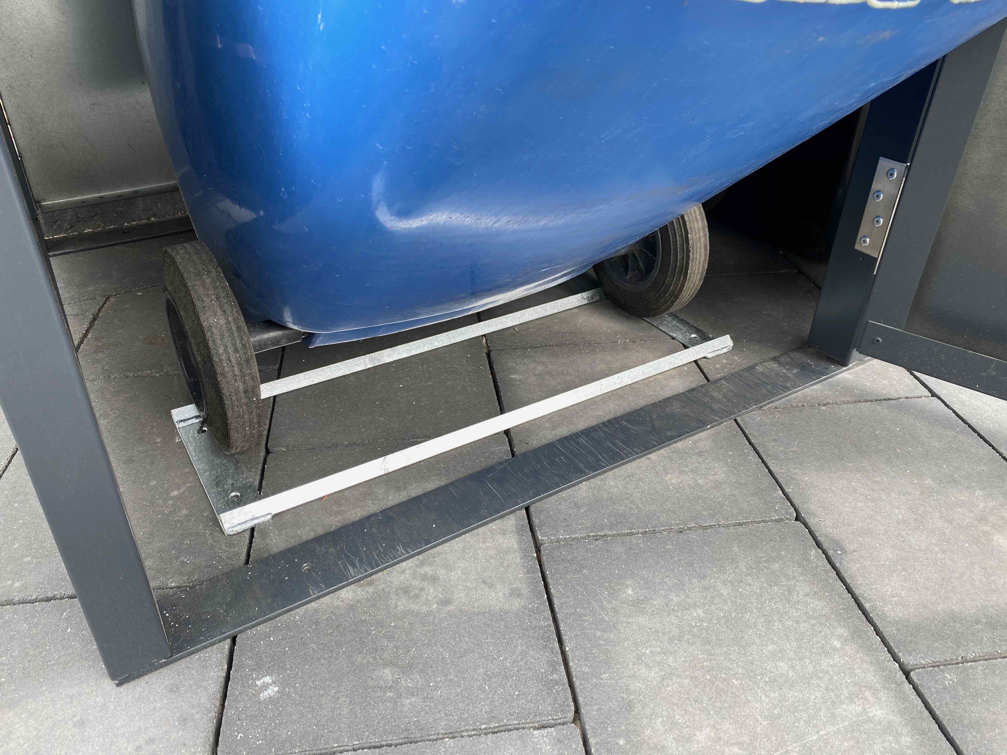 Die Kippvorrichtung für die Mülltonnenbox ORIGINAL ist eine praktische Zusatzoption, die den Bedienkomfort deutlich erhöht. Sie besteht aus einer stabilen Fangkette und einer robusten Bodenschiene und sorgt dafür, dass die Mülltonne beim Herausziehen sicher geführt und kontrolliert gekippt werden kann.