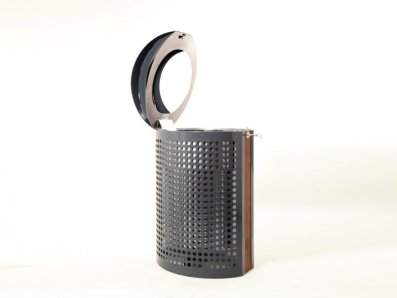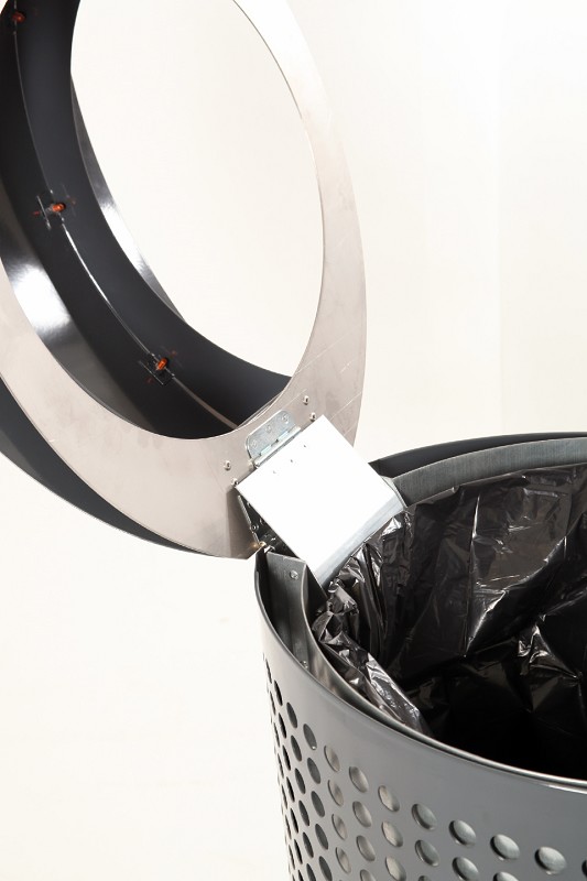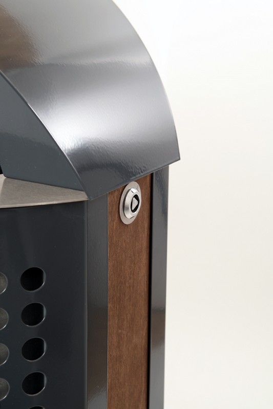 Abfallbehälter-Serie aus Stahl, mit Abdeckung, Aschereinsatz und Innenbehälter. Glutlöschfläche aus gebürstetem Edelstahl.Oberfläche: Stahl feuerverzinkt und beschichtet wahlweise in RAL 7039 (quarzgrau), RAL 6005 (moosgrün), RAL 7016 (anthrazitgrau) oder RAL 9007 (graualuminium). Korpus gelocht. Glutlöschfläche aus gebürstetem Edelstahl.Befestigung: Bodenbefestigung (zum Aufschrauben auf den Boden oder zum Aufschrauben auf einbetonierte Bodenanker.) Befestigungsmaterial bauseits.Verriegelung: Dreikantverschluss (inkl. Schlüssel).Fassungsvermögen: ca. 30 oder 100 Liter.Maße 30 Liter: Höhe ca. 685 mm, Breite ca. 475 mm, Tiefe ca. 345 mm. 100 Liter: Höhe ca. 950 mm, Breite ca. 565 mm, Tiefe ca. 470 mm.