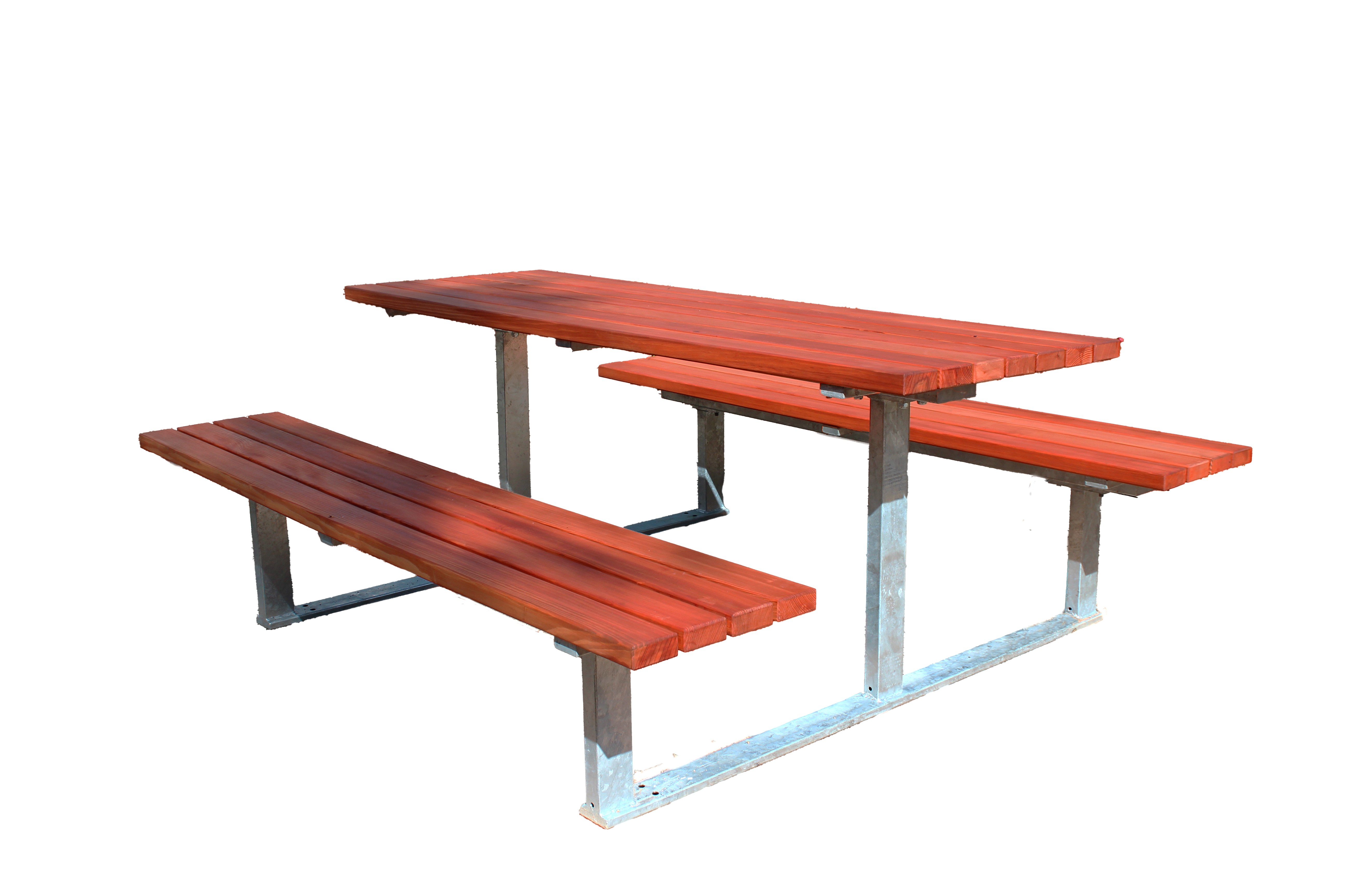 Das Gestell besteht aus verschweißten Stahlrohren. Die Belattung jedes Elements, ob Tisch, Hockerbank oder Lehnenbank, ist auf separaten Trägerrahmen montiert, der vollständig mit der Unterkonstruktion verschraubt wird. Alle Stahlteile sind feuerverzinkt und somit optimal gegen Korrosion geschützt.