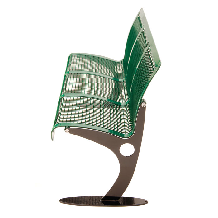 Der Rahmen besteht aus robustem Flachstahl, kombiniert mit Sitzfläche und Rückenlehne aus Drahtgitter (Ø 4,5 und 6 mm). Die Oberfläche ist verzinkt und pulverbeschichtet in klassischen RAL-Farben, was der Bank dauerhaften Witterungsschutz und eine hochwertige Optik verleiht.