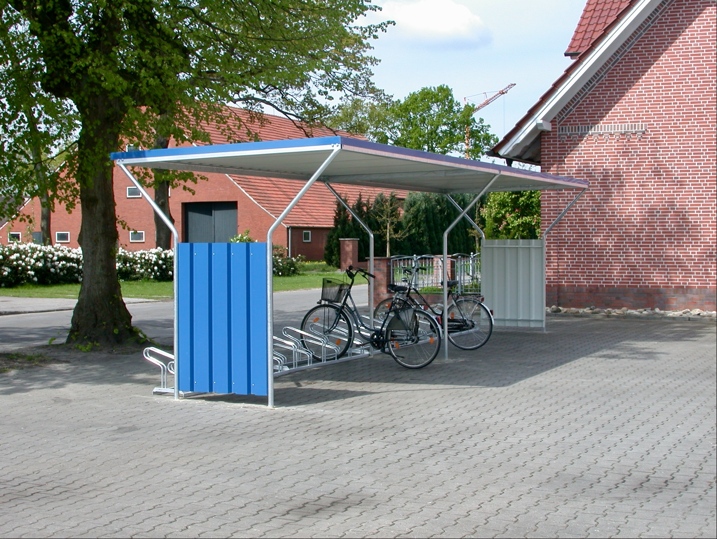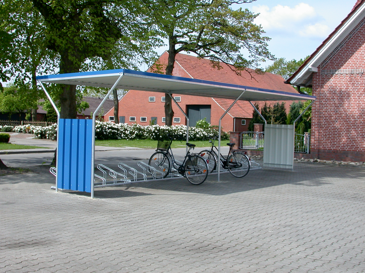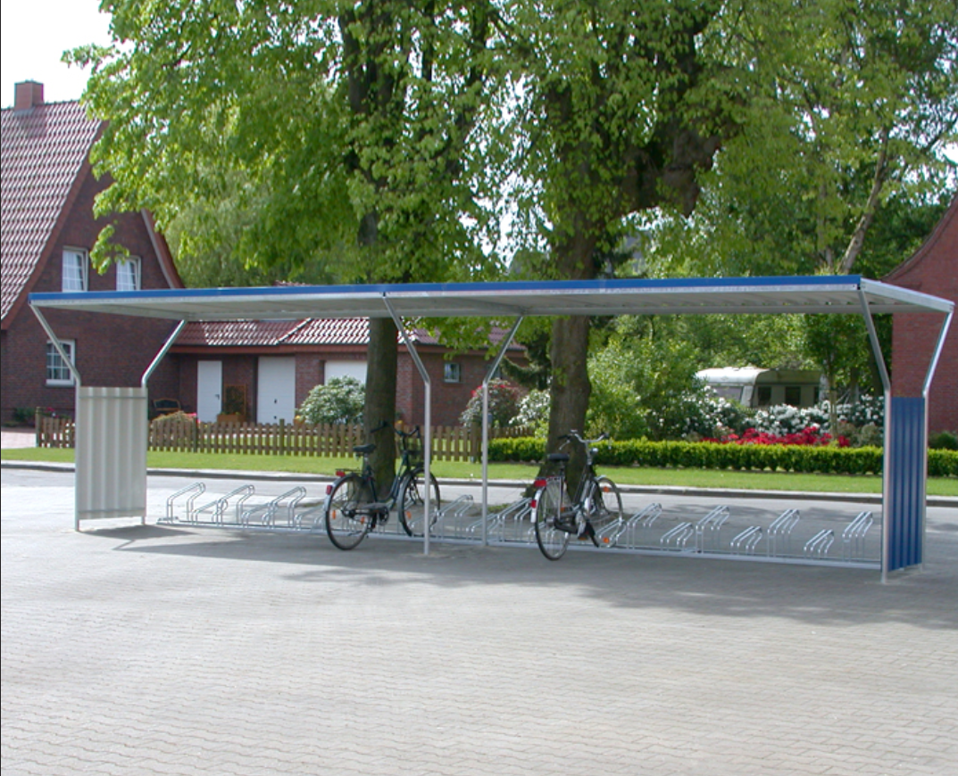 Die Rückwand ist als optionales, freistehendes Element lieferbar und erweitert den Schutz zusätzlich. Die Überdachung ist sowohl in einseitiger als auch in zweiseitiger Ausführung erhältlich und lässt sich ideal mit verschiedenen Fahrradparksystemen kombinieren.