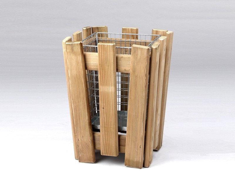 - Solider, eckiger Abfallkorb mit Holzverkleidung, der Natürlichkeit und Funktionalität vereint – ideal für Parkanlagen, Grünflächen und naturnahe Außenbereiche.
