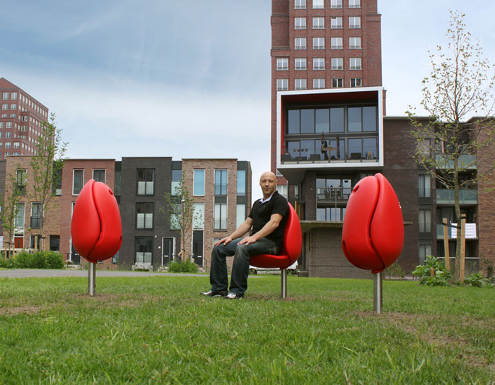 TULPI - Designer Marco MandersInnovativer Abfallbehälter in Tulpenform. Unterkonstruktion (Fuß mit runder Bodenplatte) aus Stahl, feuerverzinkt, Inox-ähnliche Farbe (graualuminium). Die Außenverkleidung besteht aus 3 Blütenblättern aus Fieberglas, Farbe Zink-gelb, die sich gleichzeitig öffnen und schließen. Innenbehälter aus Stahl, feuerverzinkt und beschichtet in schwarz. Inhalt: 42 Liter.Befestigung: Bodenbefestigung, zum Aufschrauben via Bodenplatte, ø 300 mm:Höhe: 1194 mm, Breite: 470 mm, mit auseinandergeklappten Blütenblättern = 918 mm. Tiefe: 470 mm, Gewicht = ca. 21 kg