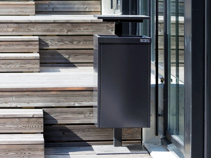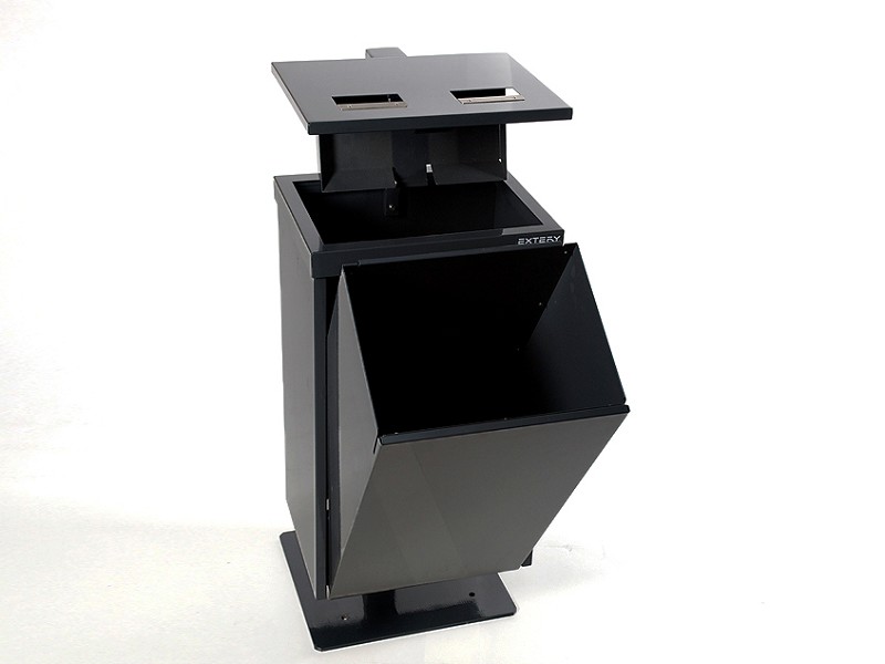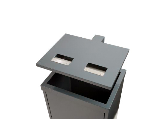 • Moderner, vandalismushemmender Abfallbehälter mit Abdeckung und integriertem Aschereinsatz, ideal für stark frequentierte Außenbereiche, Bahnhöfe oder Eingangsbereiche.