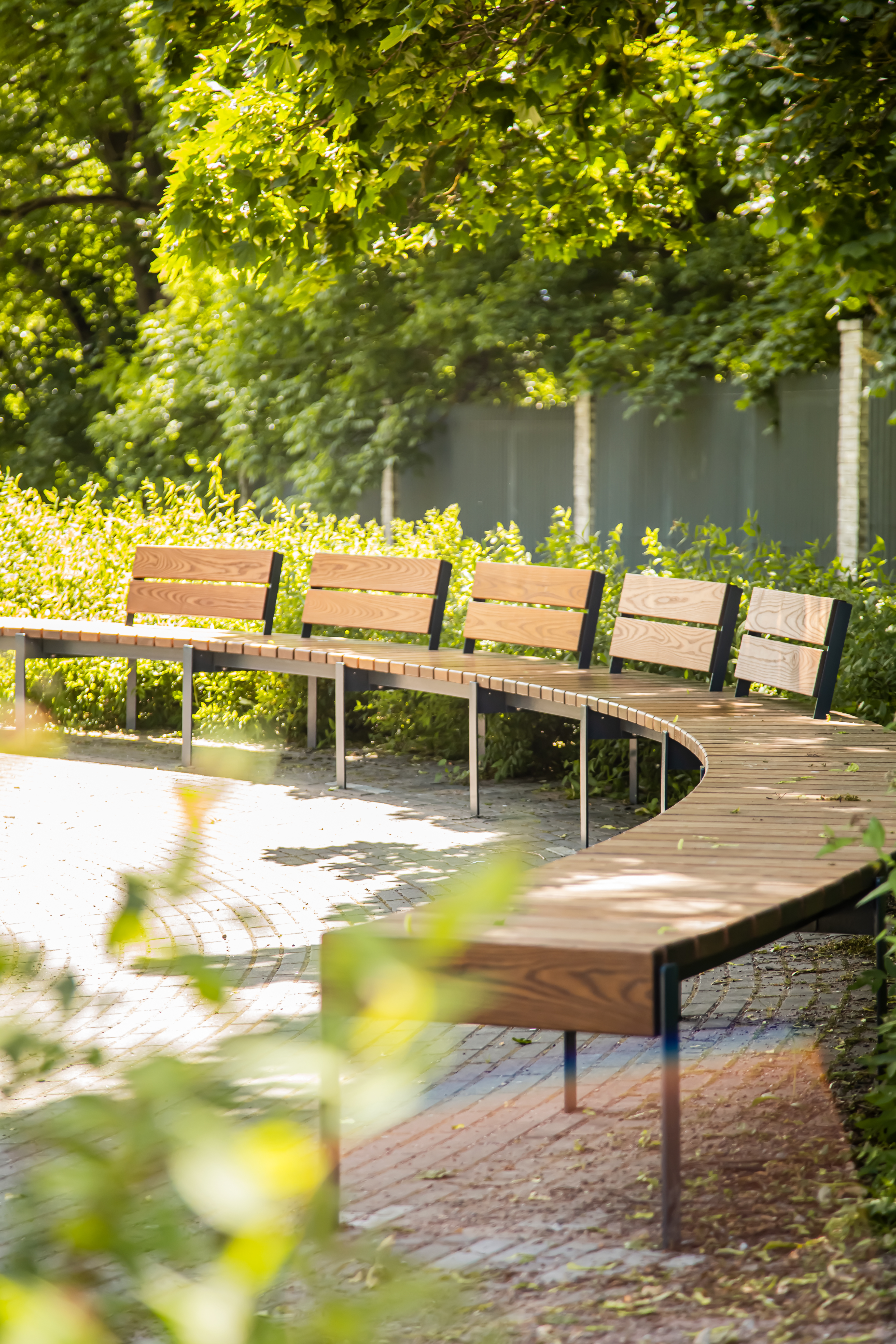 Diese Variante zeigt, wie sich mit dem modularen Banksystem großzügige Rundungen und geschlossene Sitzkreise gestalten lassen. Die einzelnen Bankelemente können flexibel kombiniert werden und schaffen kommunikative Aufenthaltsbereiche mit einer offenen, einladenden Wirkung.